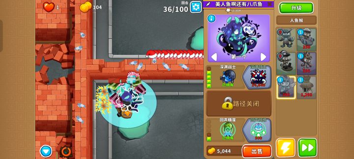 这关只是开局比较难,慢慢来会发现后期很简单。无需知识,力量和双金!开局在下方的夹角处放下英雄奥本,再在旁边水池的最上方放下200人鱼猴。可以把奥本目标改成强力击破更多气球减少损失的生命,钱够了把人鱼猴升到201。第18回合最好等密集的绿气球来时再用奥本的荆棘技能!之后在贴近人鱼猴的下方放下海盗猴,钱够了先升010。此时奥本的技能有了就用,先升人鱼猴至301来增加伤害和穿透,再把海盗猴升到020