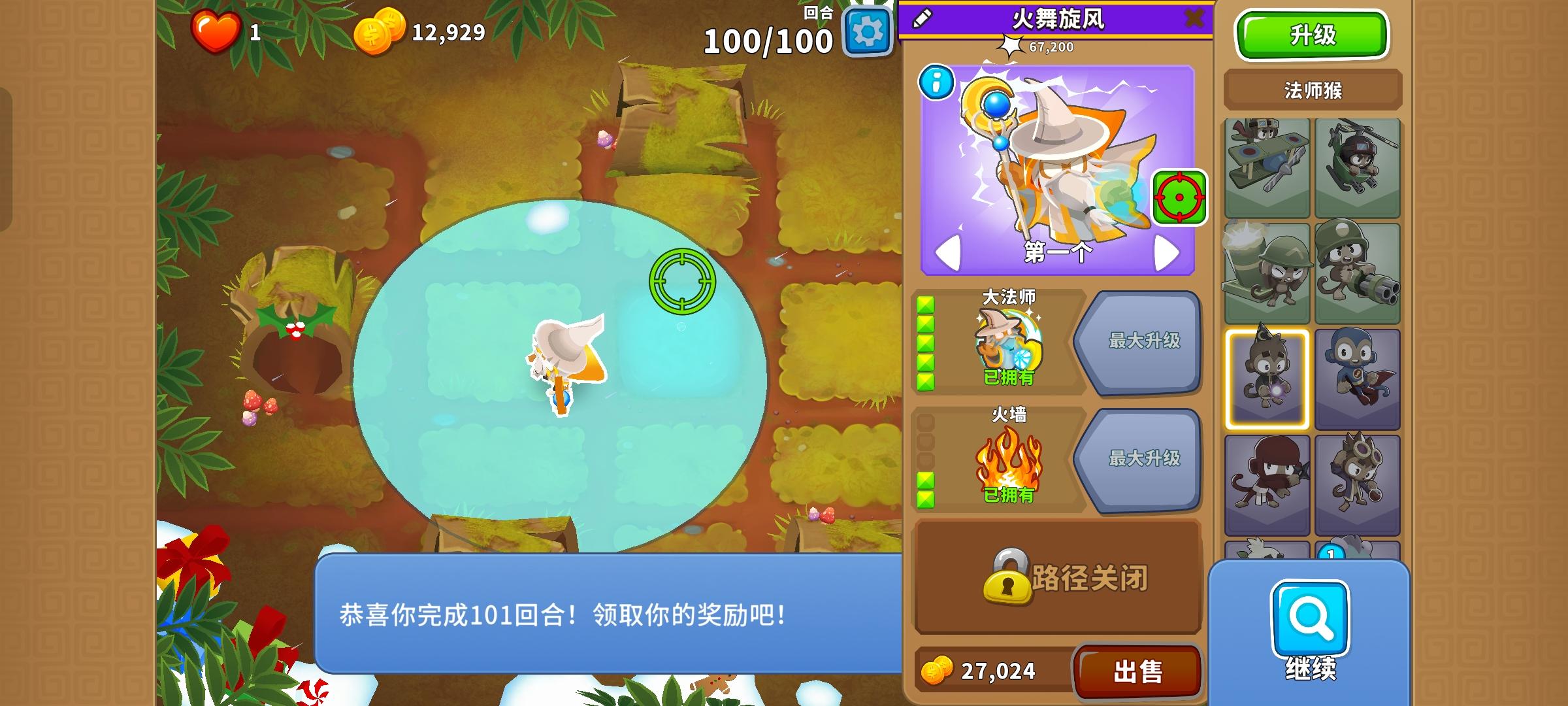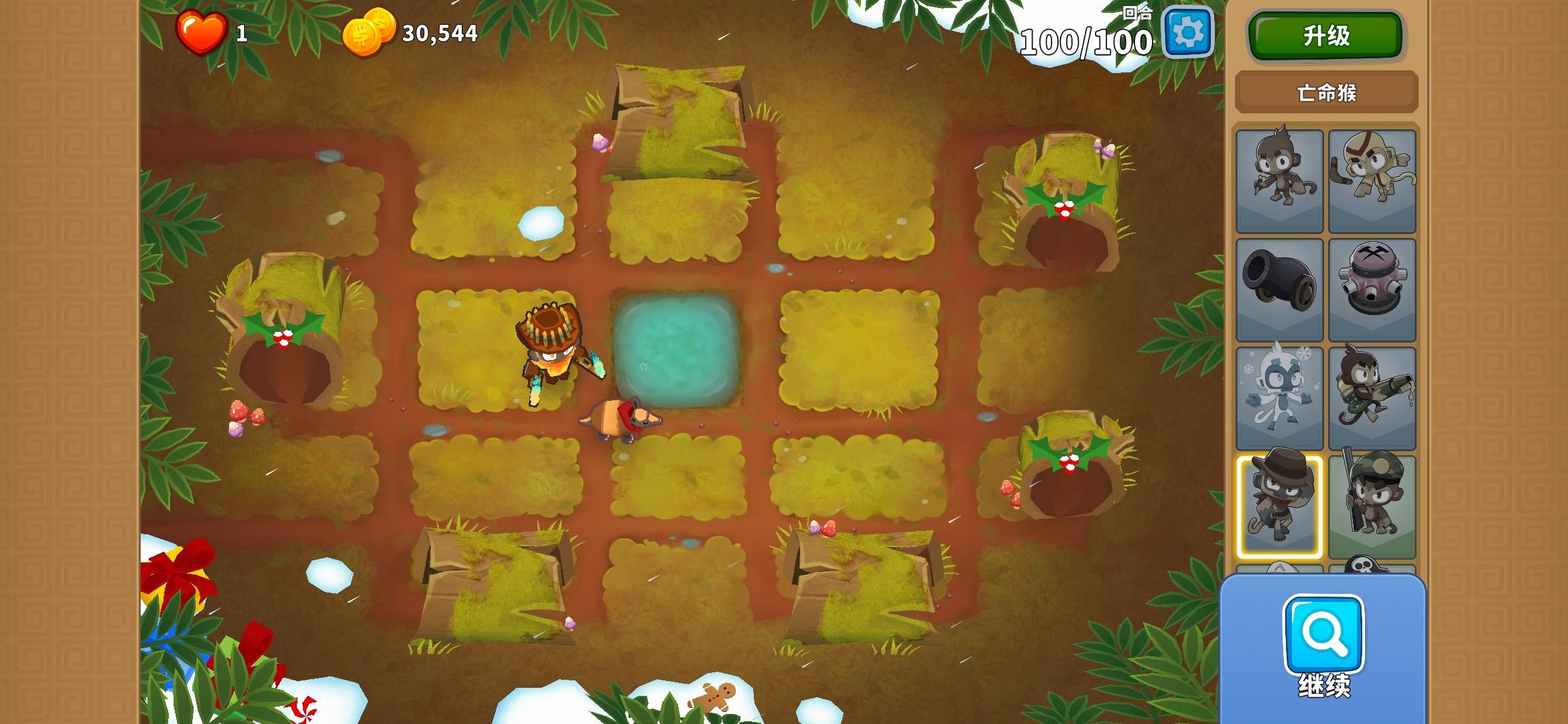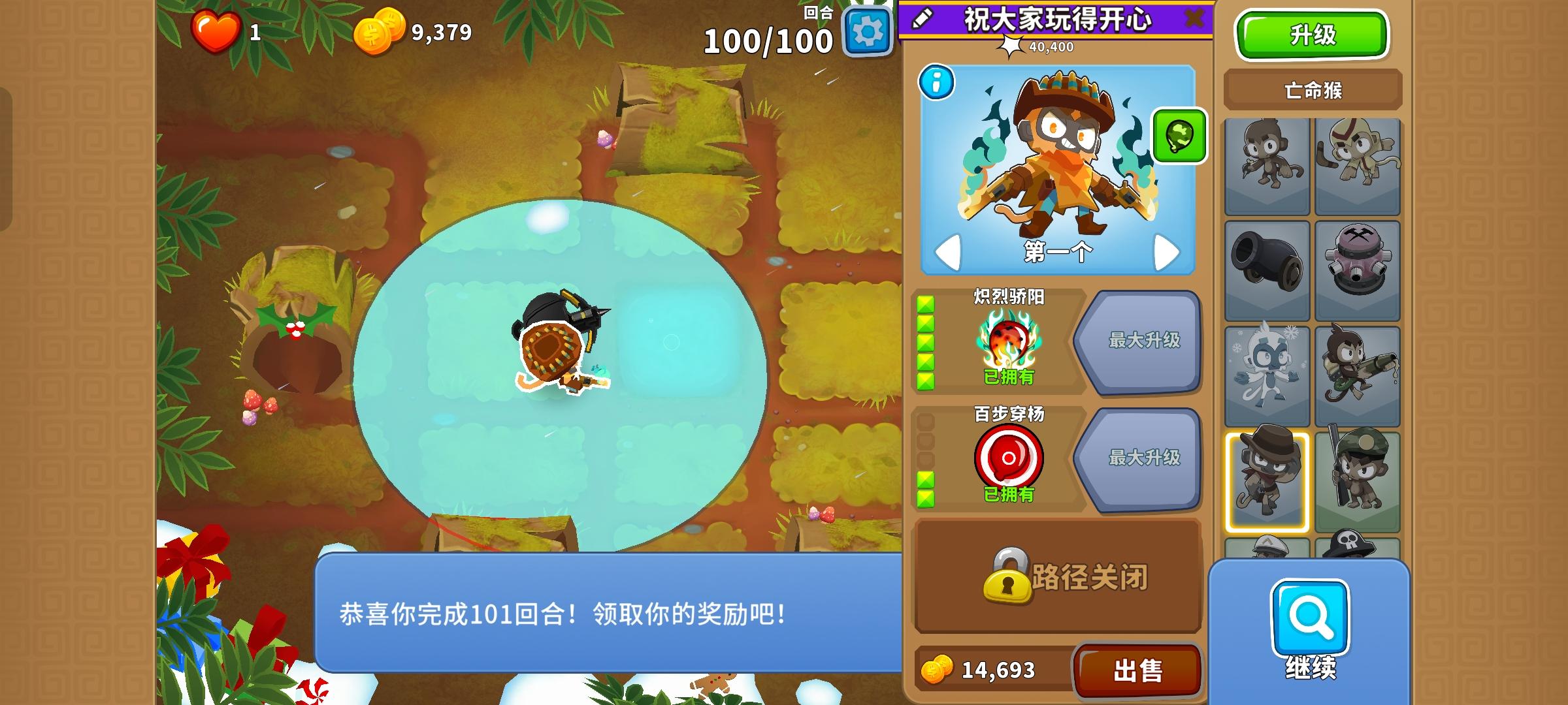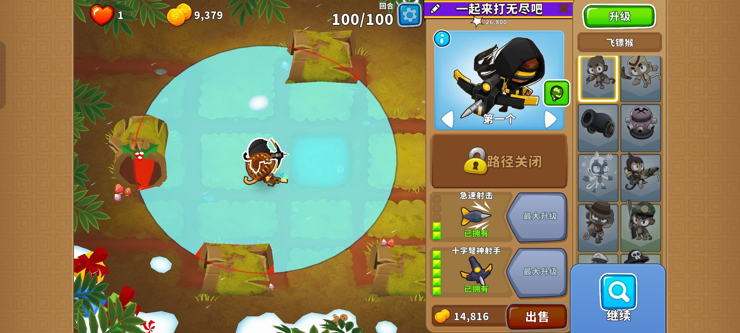 也是受猴友们启发去找精英充气机刷钱了因为是高级的八阶段充气机,为了保证战力上了之前刷钱拉的真太阳神,中路刺钉地毯顶掉一些复仇气球,还有一个缩小版国土防御。不过还是得不忘初心,剩下的位置刷了三个比较给力的加钱猴子(真能刷到加钱飞机还是挺惊喜的)。加上警长套装这套总共加钱40%,Boss战直接堆在一块,甚至连警长都不用上,迫击炮的落点也不用改,只需要不停点国土防御就能过了。还是不需要