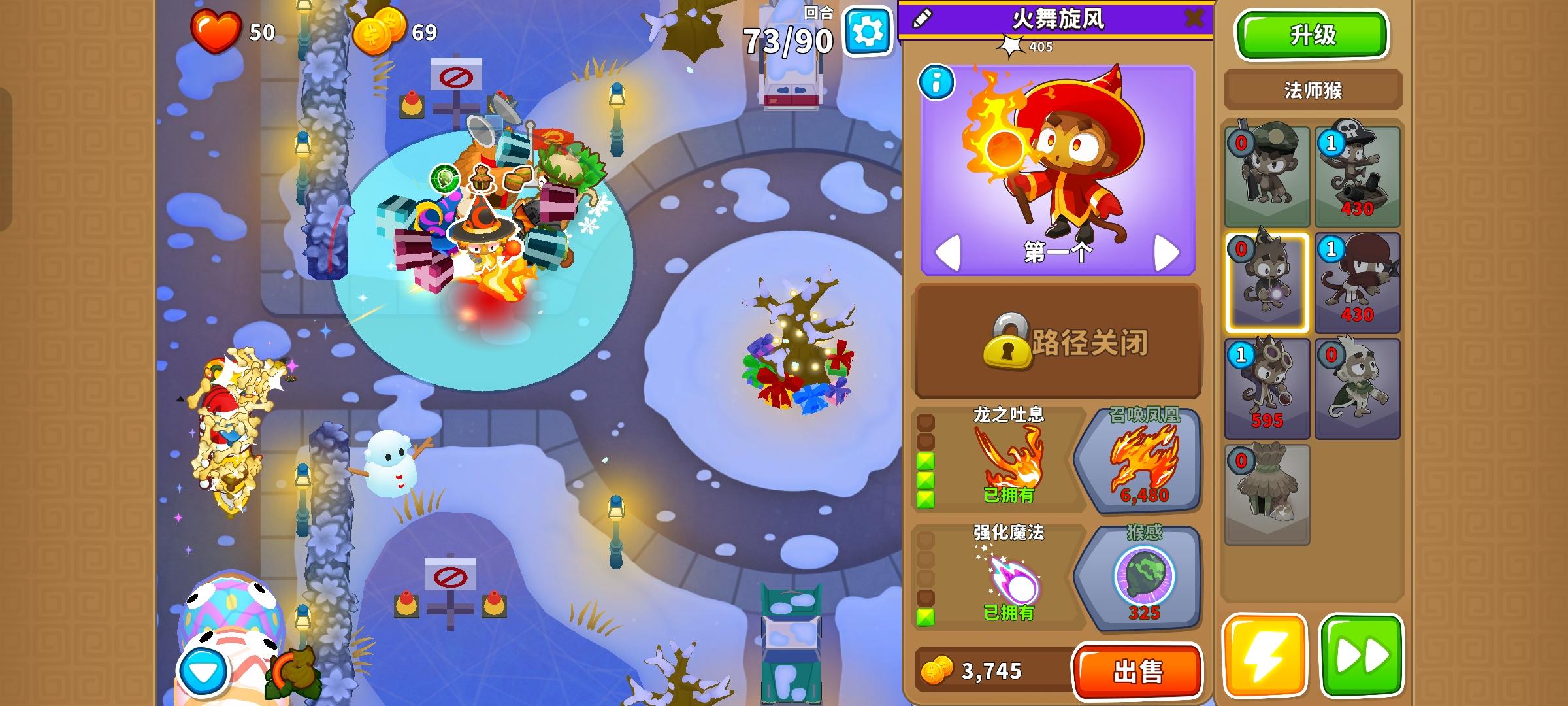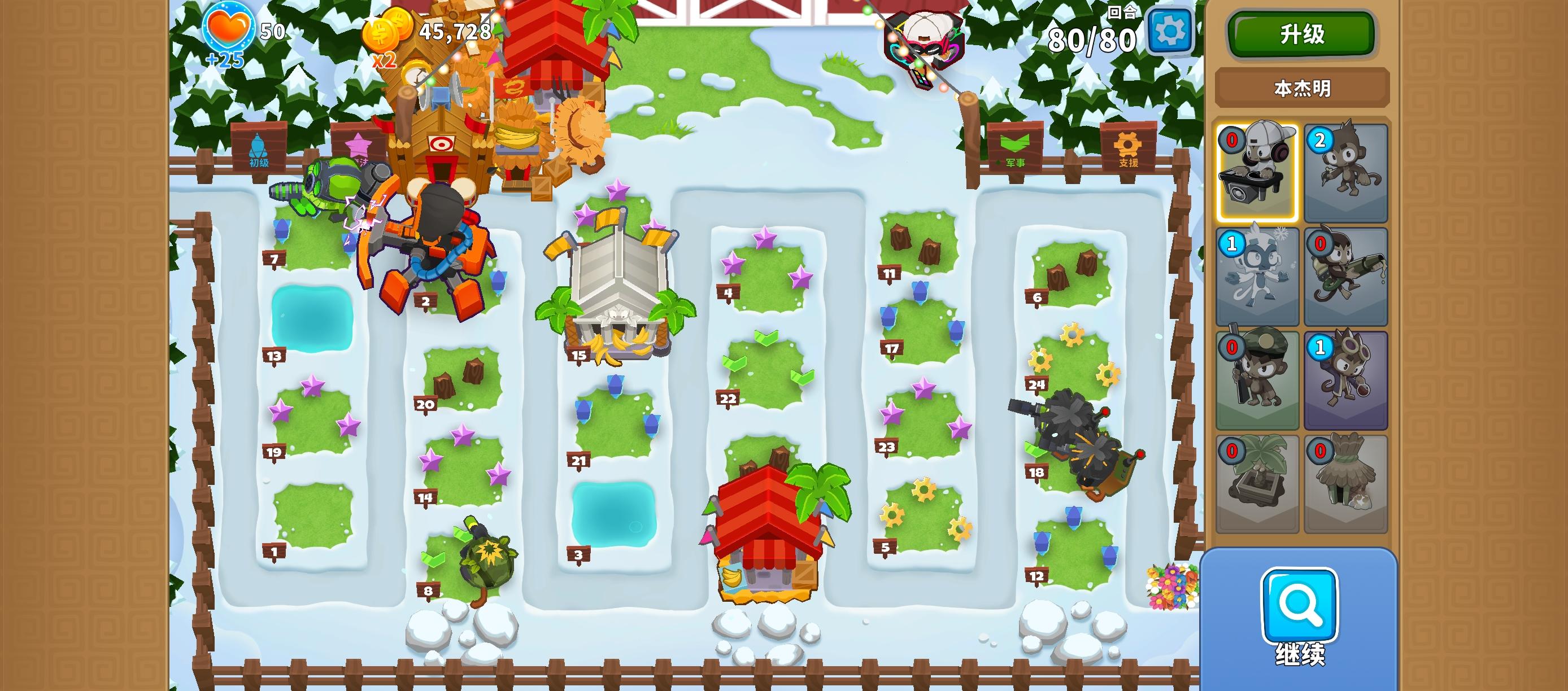 书接上回,现在可以分享困难征程岛4的攻略了,无需知识、力量、双金和英雄!这次是天启模式,比的就是手速和运气。开局赶紧在图上这个位置放下025狙击手猴,然后在右上角挨着它放下040-140德鲁伊,有技能就用!之后在他俩之间的夹角放下020猴子村,快速升到220。然后狙击手猴的左侧放下两个基础法师猴,先把左侧的升到401,再把右侧的升到032-042。期间如果气球太多就用法师猴的技能。然后在最左侧放
