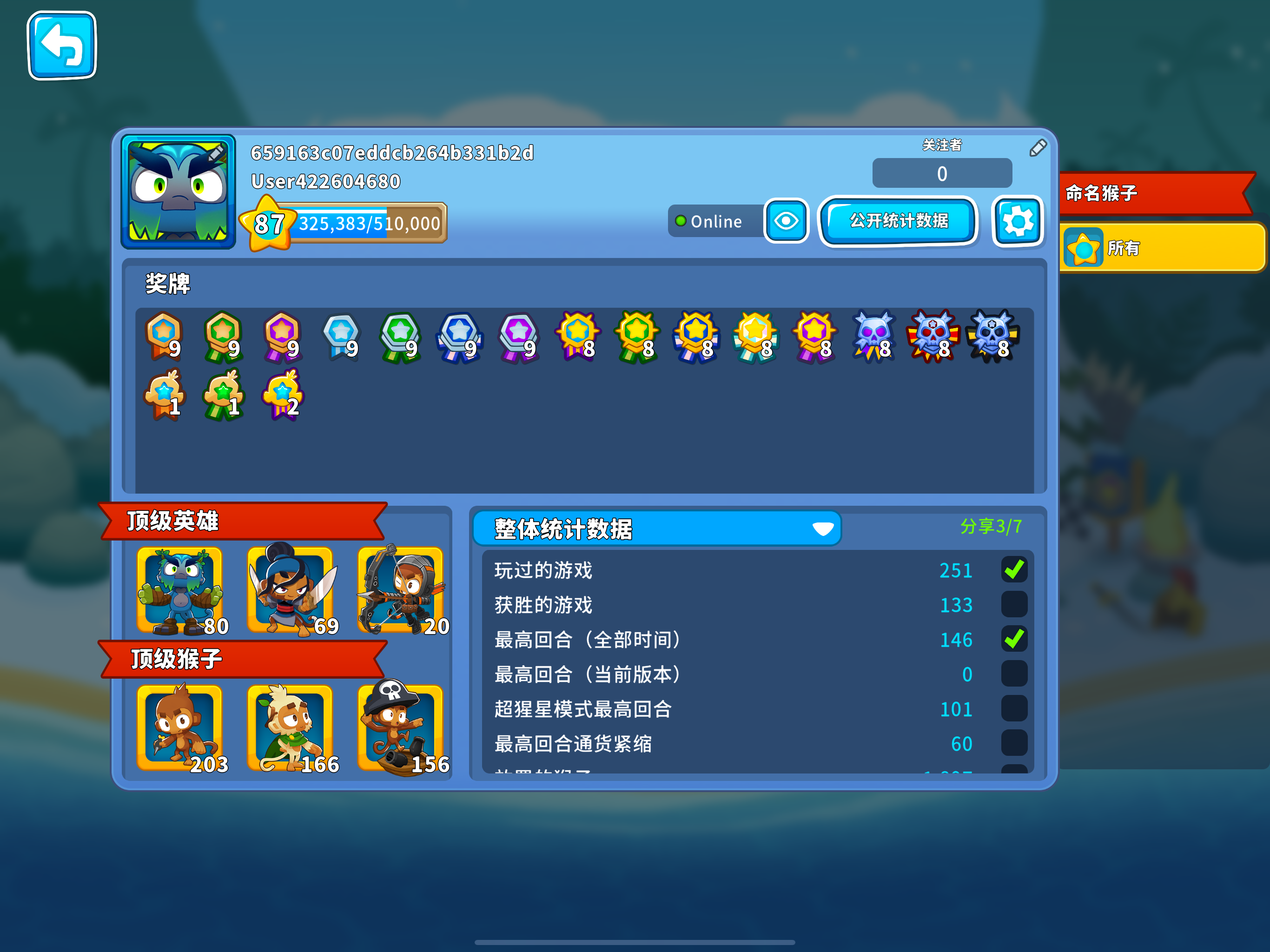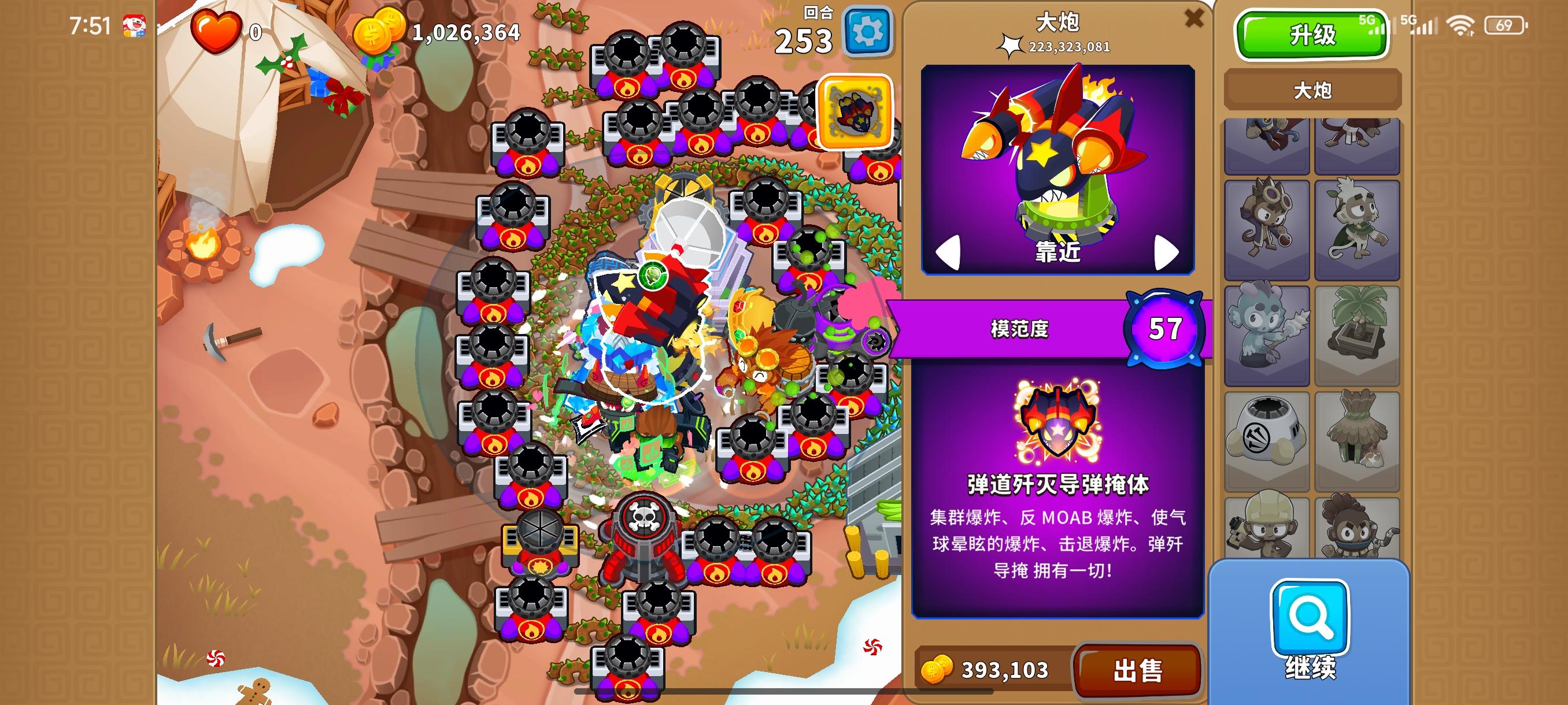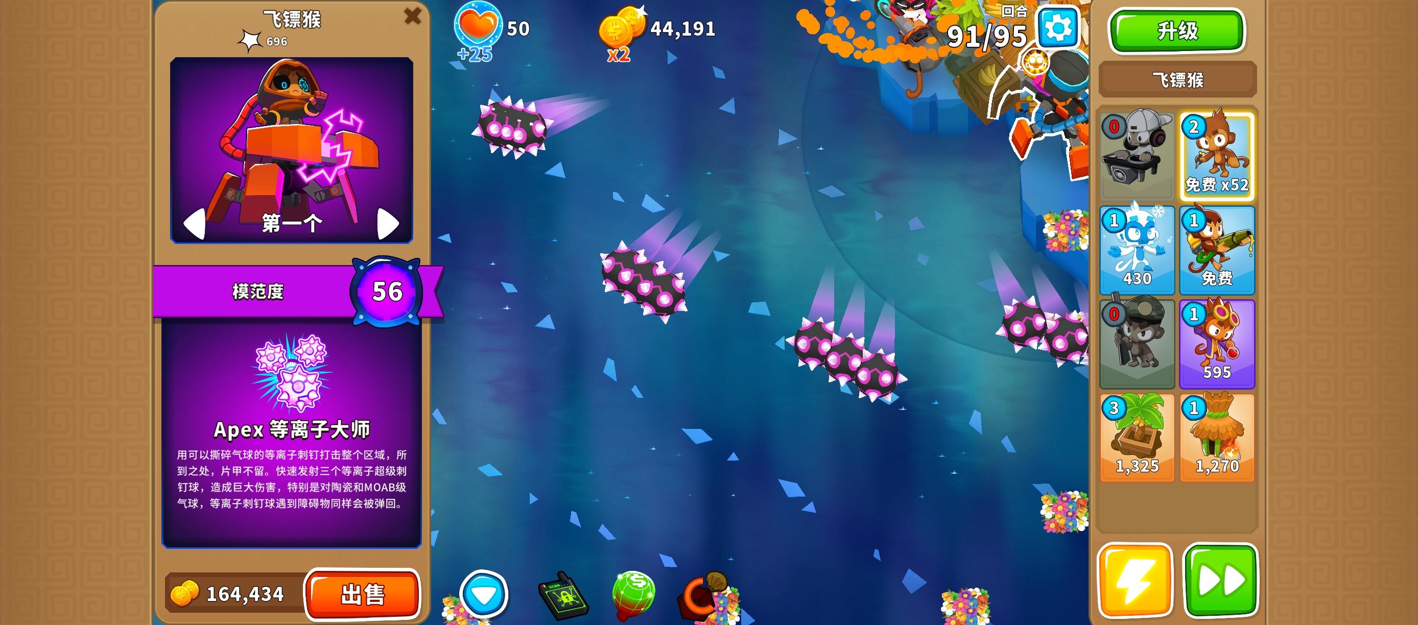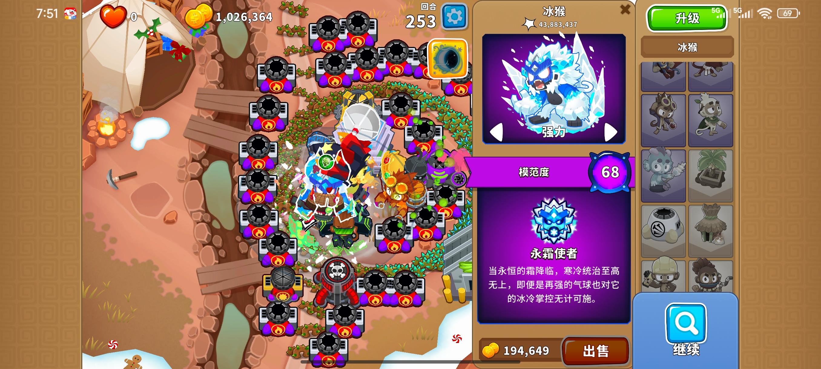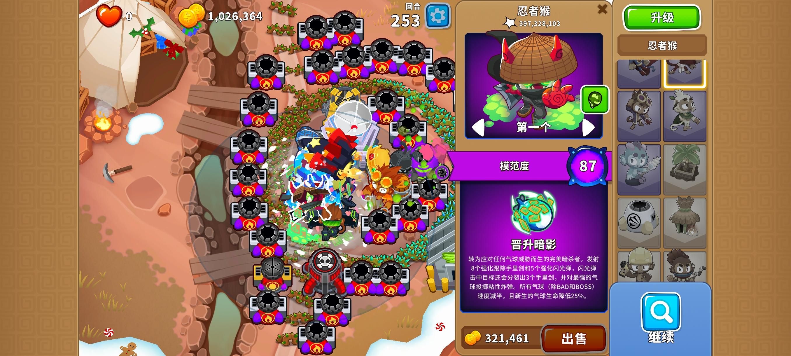 发现只能用本杰明才能搞到这么多钱,用其他的模范没出来140关的紫色MOBA气球就顶不住了。模范的强度不得不说,还是海盗猴比较强,其他都很一般。想来想去还是用黑太阳神吧永爽使者其实配合新出的冰系英雄还是不错的
