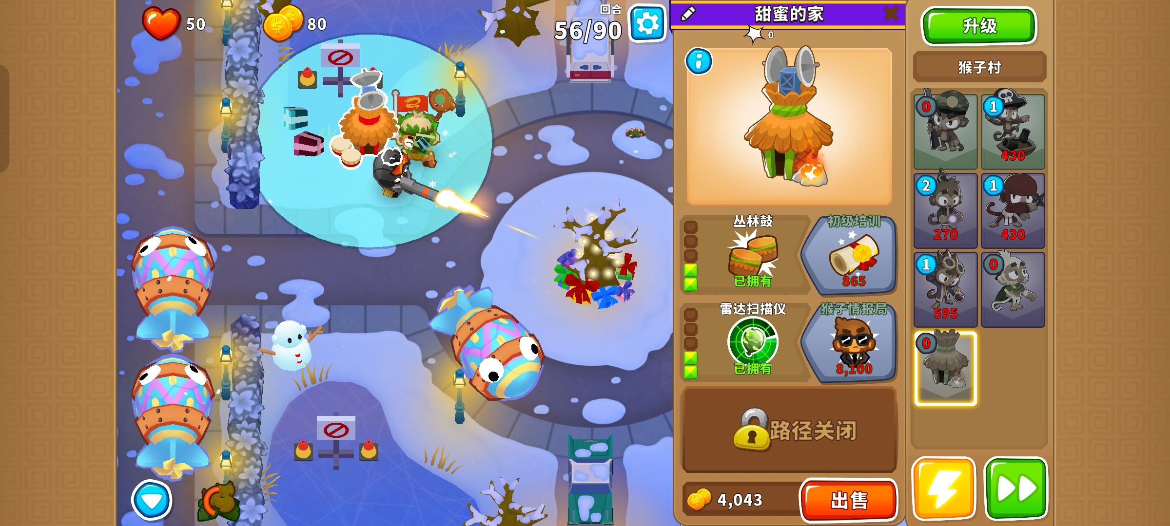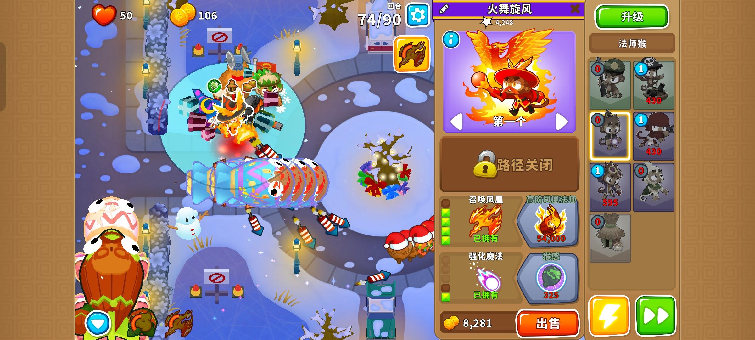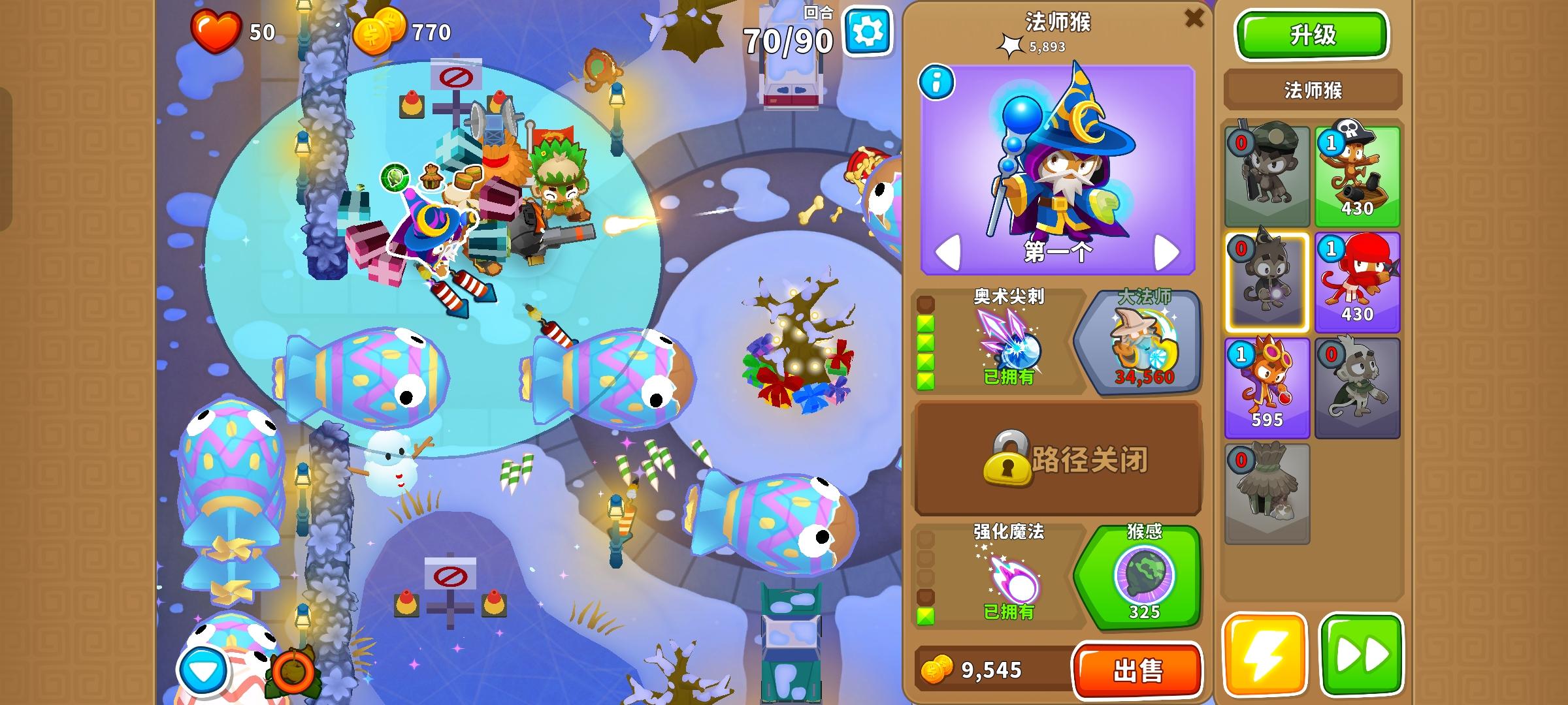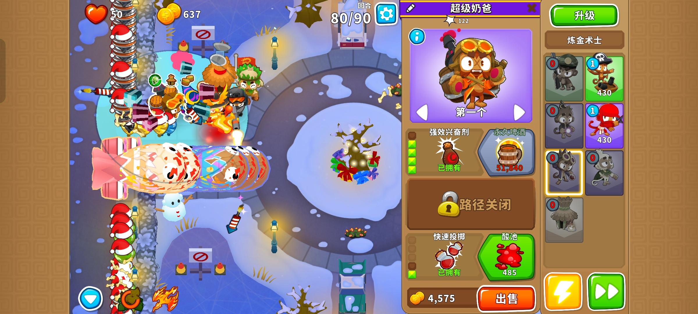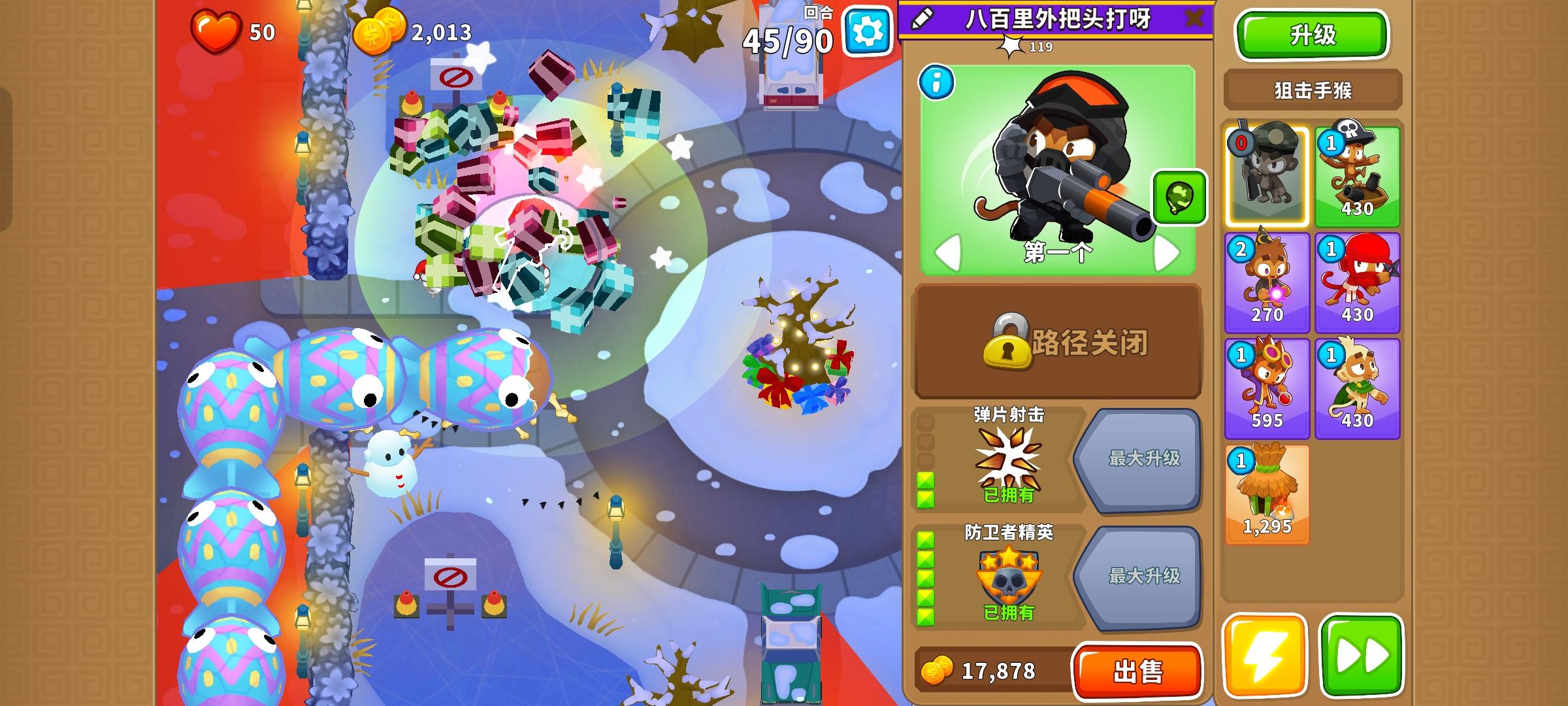 也是受猴友们启发去找精英充气机刷钱了因为是高级的八阶段充气机,为了保证战力上了之前刷钱拉的真太阳神,中路刺钉地毯顶掉一些复仇气球,还有一个缩小版国土防御。不过还是得不忘初心,剩下的位置刷了三个比较给力的加钱猴子(真能刷到加钱飞机还是挺惊喜的)。加上警长套装这套总共加钱40%,Boss战直接堆在一块,甚至连警长都不用上,迫击炮的落点也不用改,只需要不停点国土防御就能过了。还是不需要