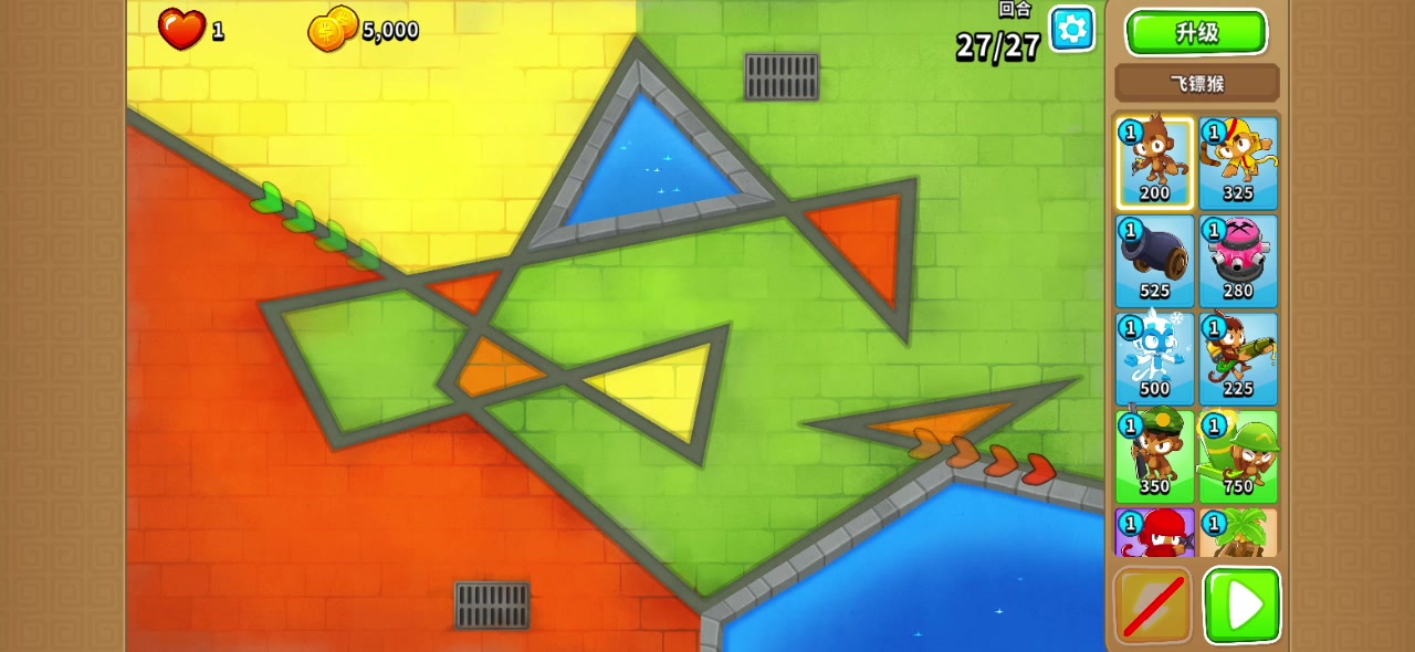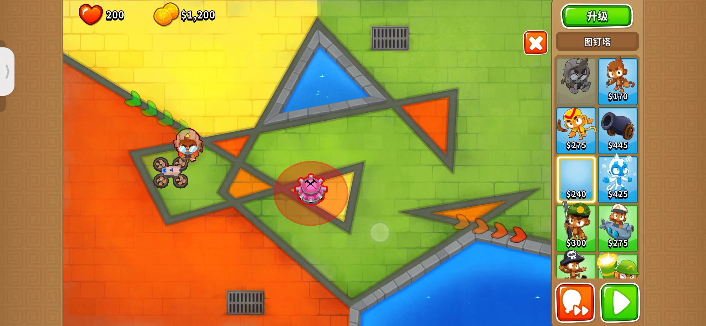 104忍者开局,击破第一层之后升级205狙击手,之后起205图钉+炼金猴,出502狙击手+520冰猴+052胶水增加飞艇受到的伤害