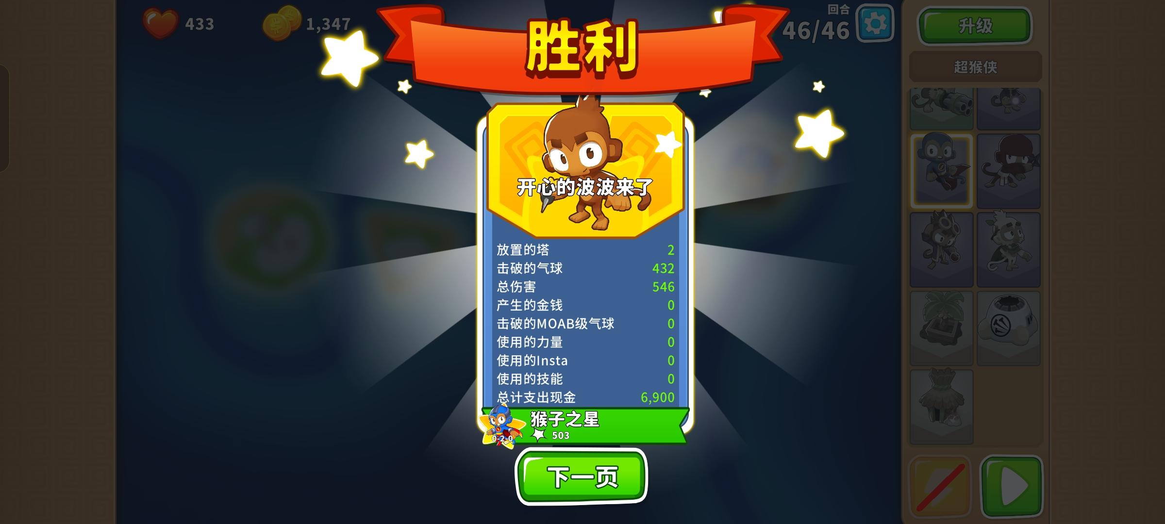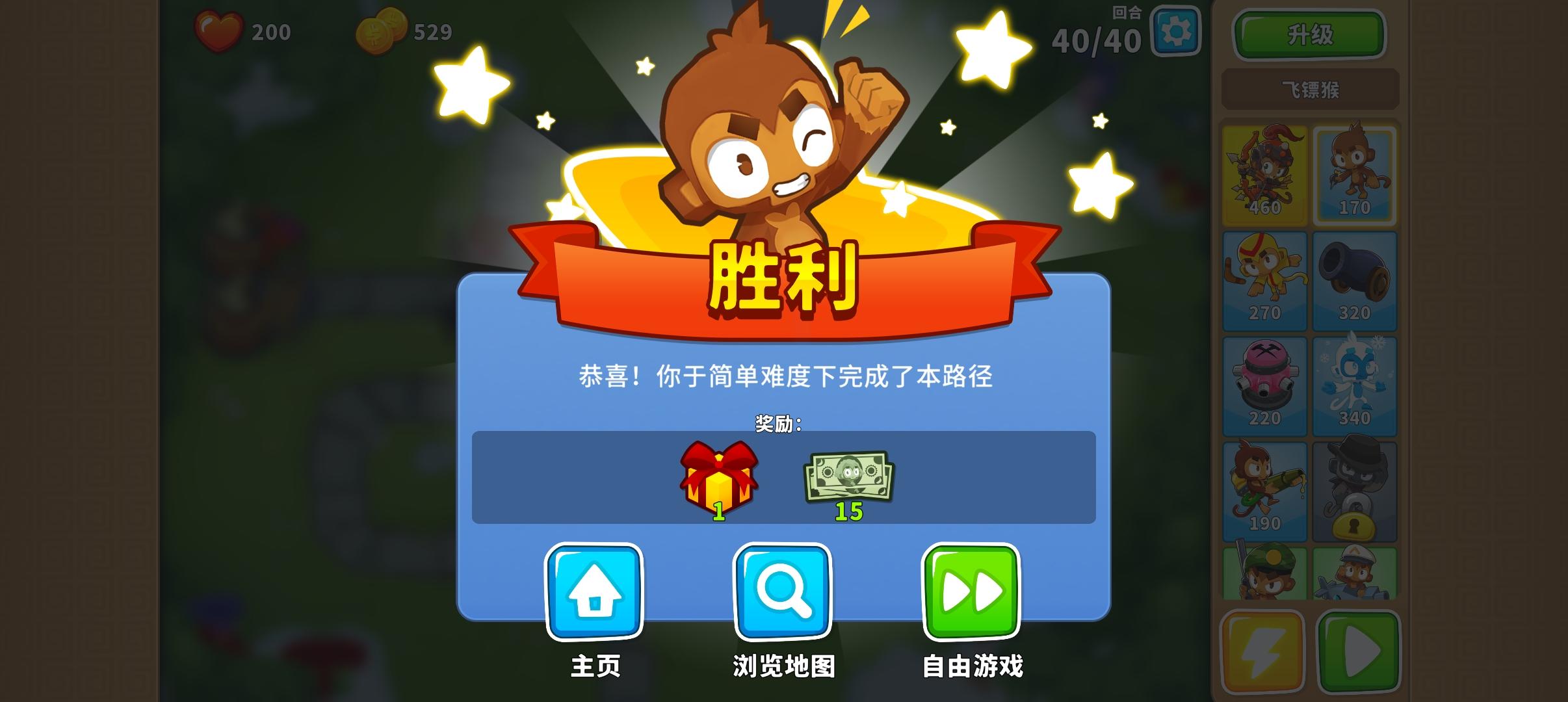 也是受猴友们启发去找精英充气机刷钱了因为是高级的八阶段充气机,为了保证战力上了之前刷钱拉的真太阳神,中路刺钉地毯顶掉一些复仇气球,还有一个缩小版国土防御。不过还是得不忘初心,剩下的位置刷了三个比较给力的加钱猴子(真能刷到加钱飞机还是挺惊喜的)。加上警长套装这套总共加钱40%,Boss战直接堆在一块,甚至连警长都不用上,迫击炮的落点也不用改,只需要不停点国土防御就能过了。还是不需要