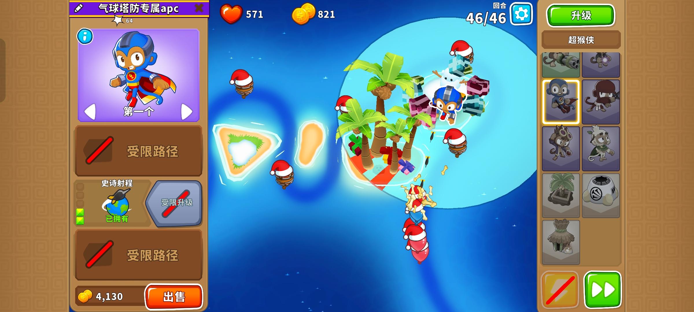 只能用一个猴子,但是可以出售,那就在最左侧的岛上放下020德鲁伊消除重生效果,全部消除后赶紧卖了换成020超猴侠放在最右侧的岛上就行!#今天游戏圈发生了啥 #单机游戏 #气球塔防6 #游戏攻略 #游戏日常
