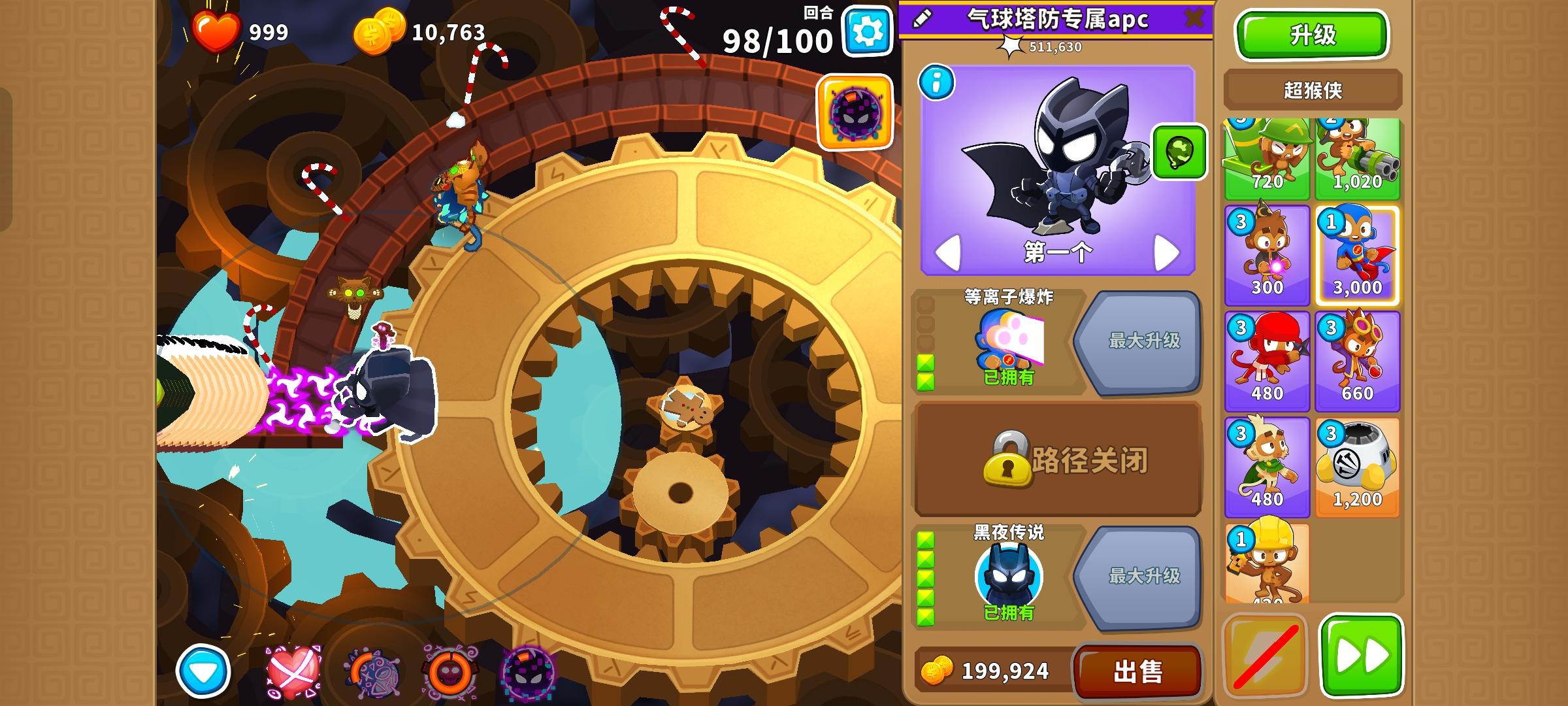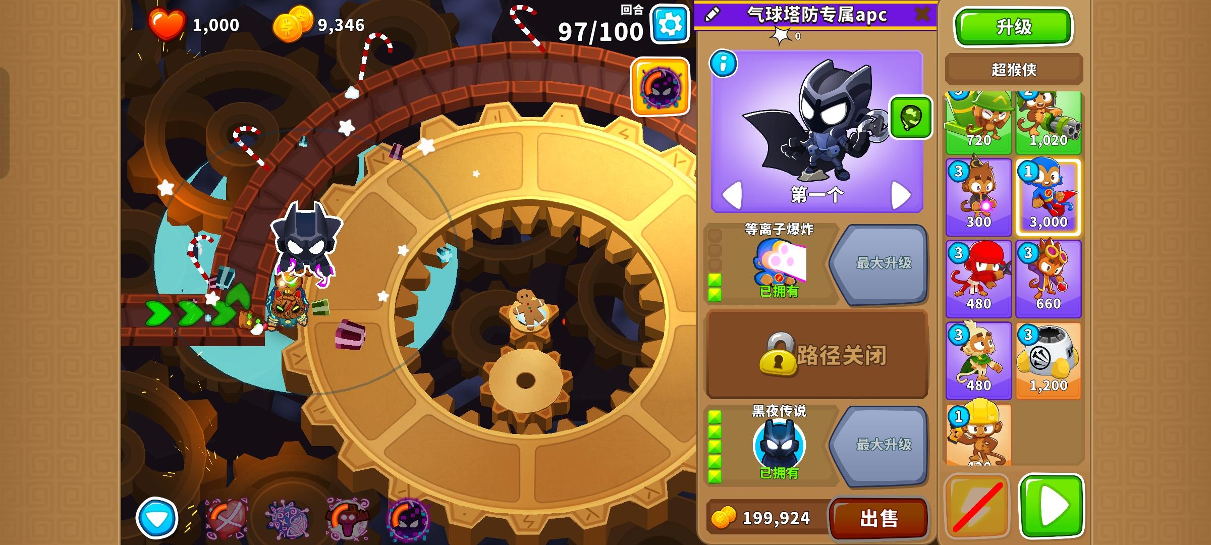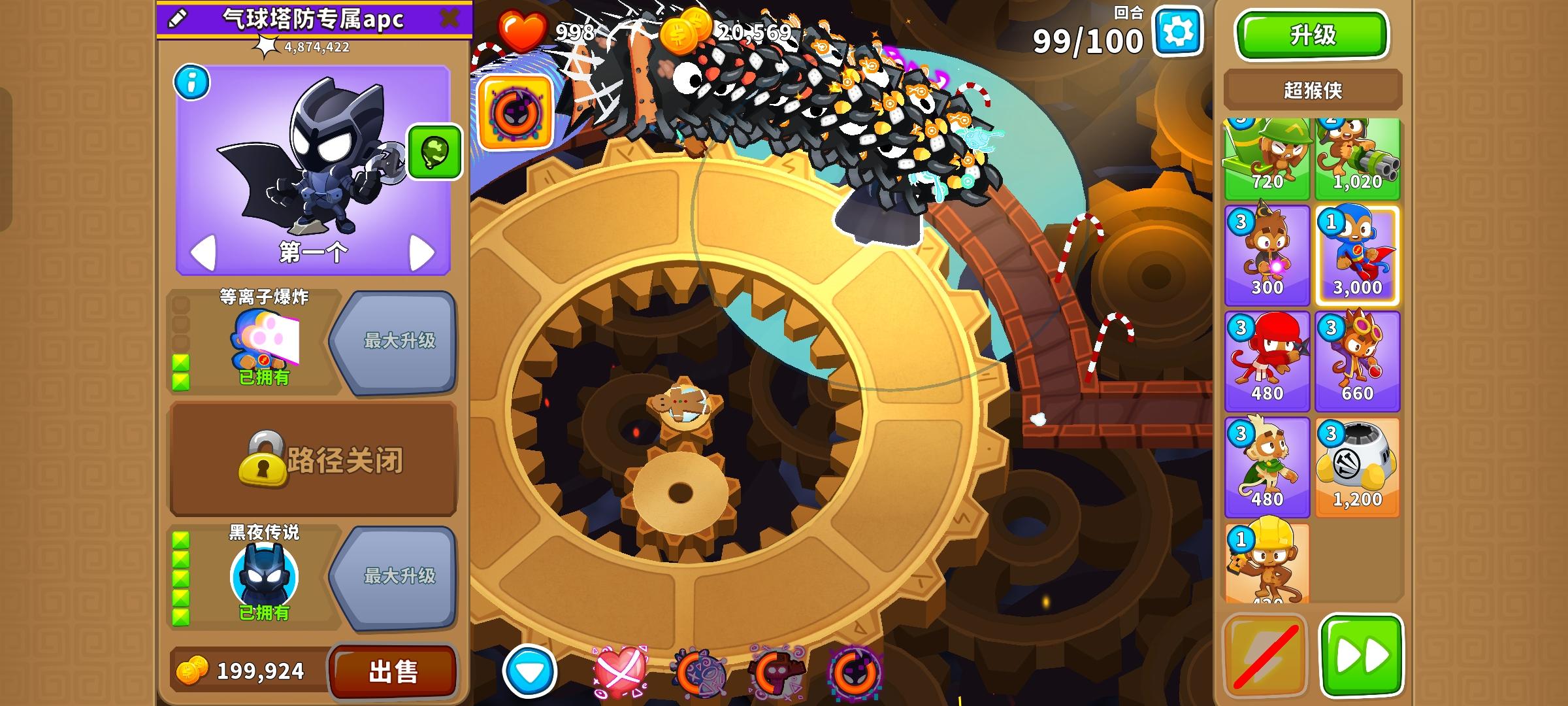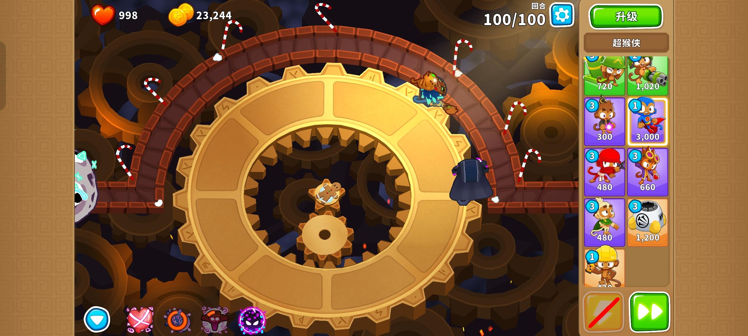 也是受猴友们启发去找精英充气机刷钱了因为是高级的八阶段充气机,为了保证战力上了之前刷钱拉的真太阳神,中路刺钉地毯顶掉一些复仇气球,还有一个缩小版国土防御。不过还是得不忘初心,剩下的位置刷了三个比较给力的加钱猴子(真能刷到加钱飞机还是挺惊喜的)。加上警长套装这套总共加钱40%,Boss战直接堆在一块,甚至连警长都不用上,迫击炮的落点也不用改,只需要不停点国土防御就能过了。还是不需要
