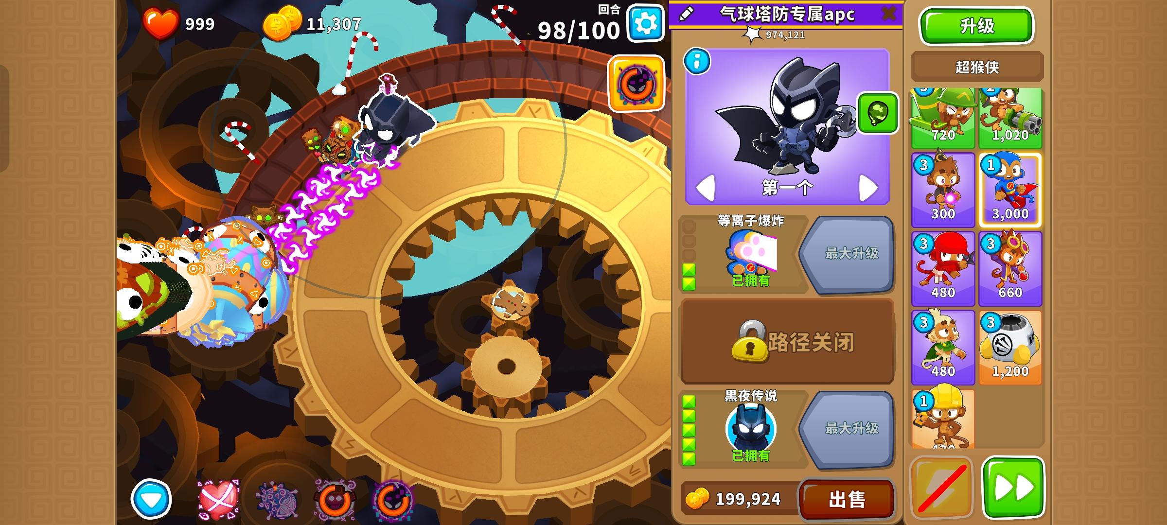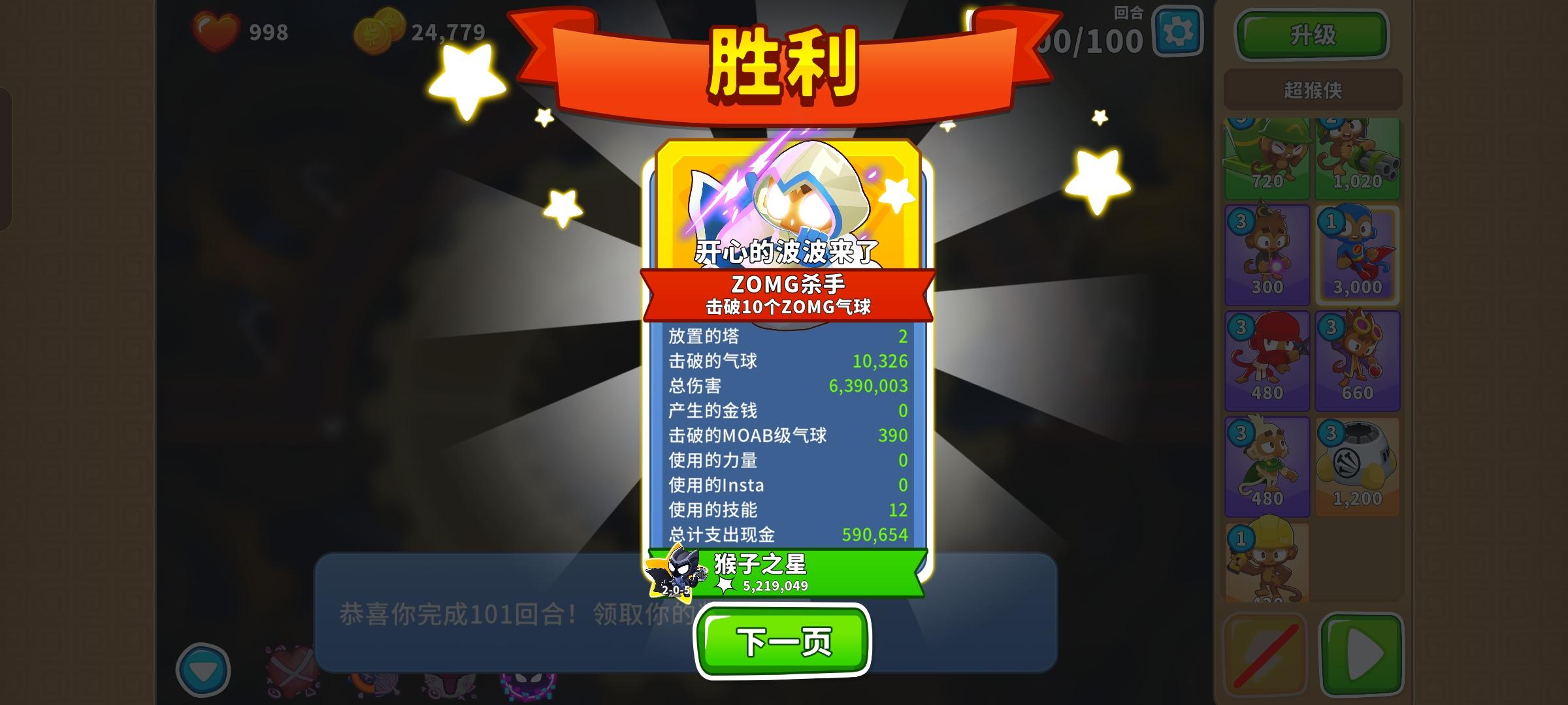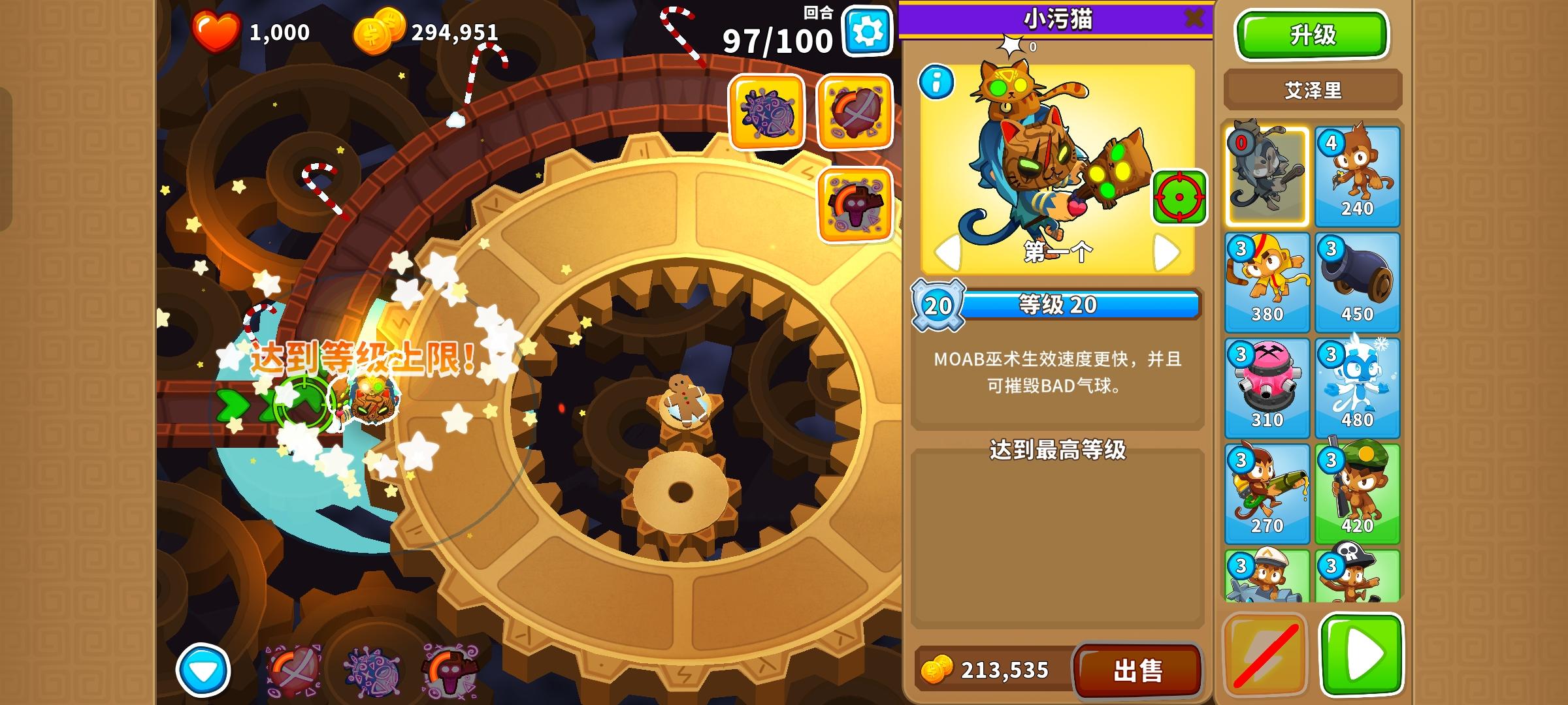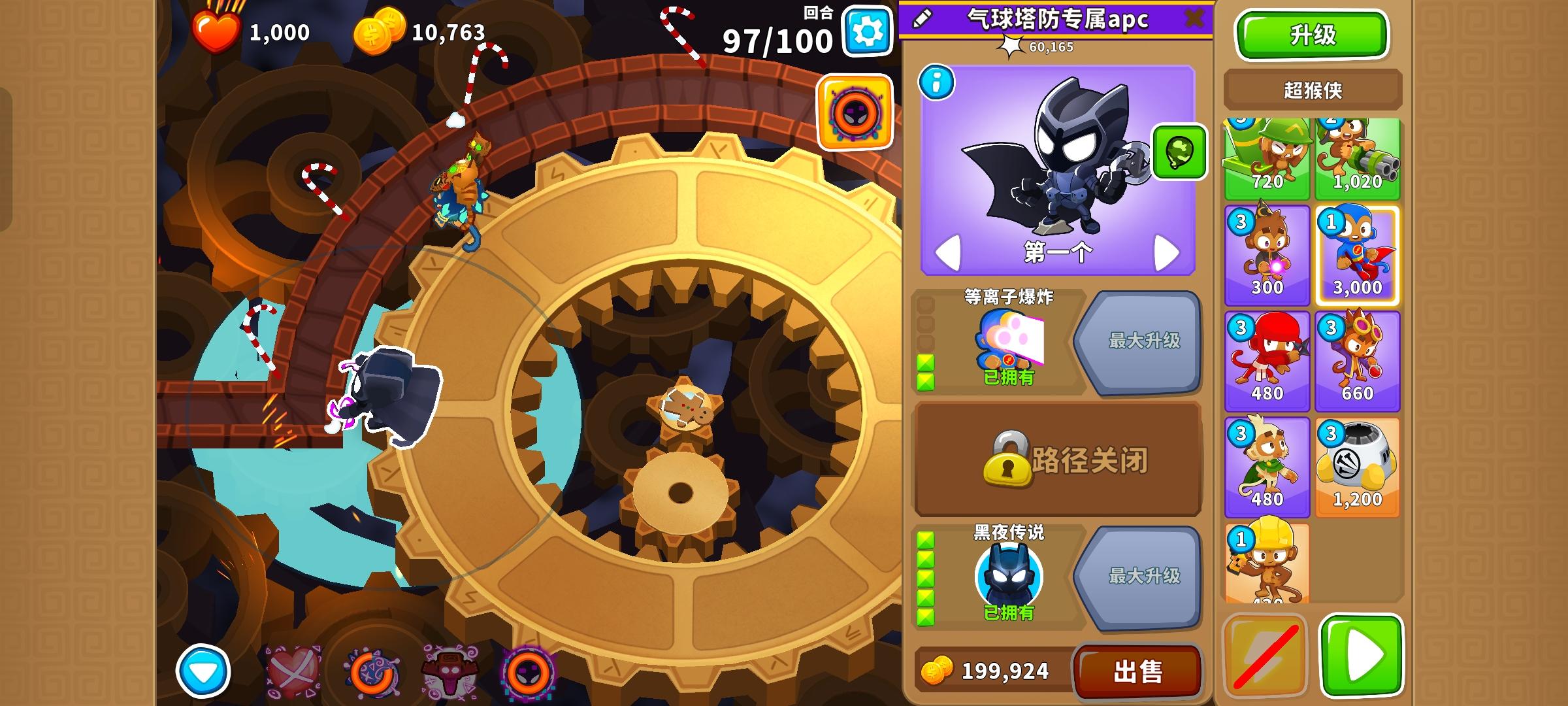 也是受猴友们启发去找精英充气机刷钱了因为是高级的八阶段充气机,为了保证战力上了之前刷钱拉的真太阳神,中路刺钉地毯顶掉一些复仇气球,还有一个缩小版国土防御。不过还是得不忘初心,剩下的位置刷了三个比较给力的加钱猴子(真能刷到加钱飞机还是挺惊喜的)。加上警长套装这套总共加钱40%,Boss战直接堆在一块,甚至连警长都不用上,迫击炮的落点也不用改,只需要不停点国土防御就能过了。还是不需要