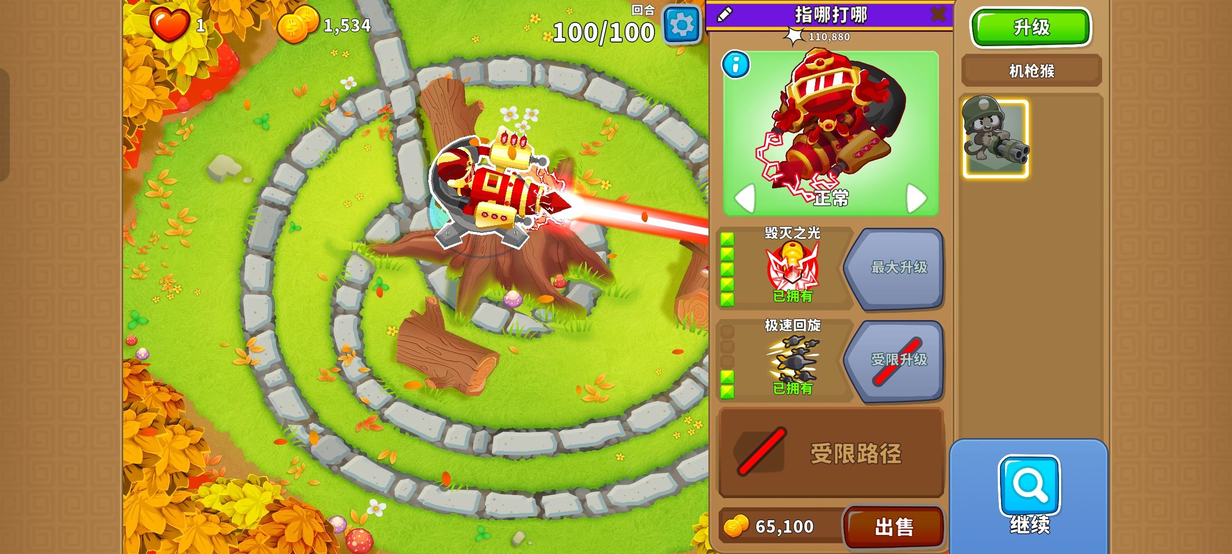 在树桩顶上放下520机枪猴,需要仔细地手操,毕竟陶瓷气球变得更肉,一不留神就会失败哟!#今天游戏圈发生了啥 #单机游戏 #气球塔防6 #游戏攻略 #游戏日常