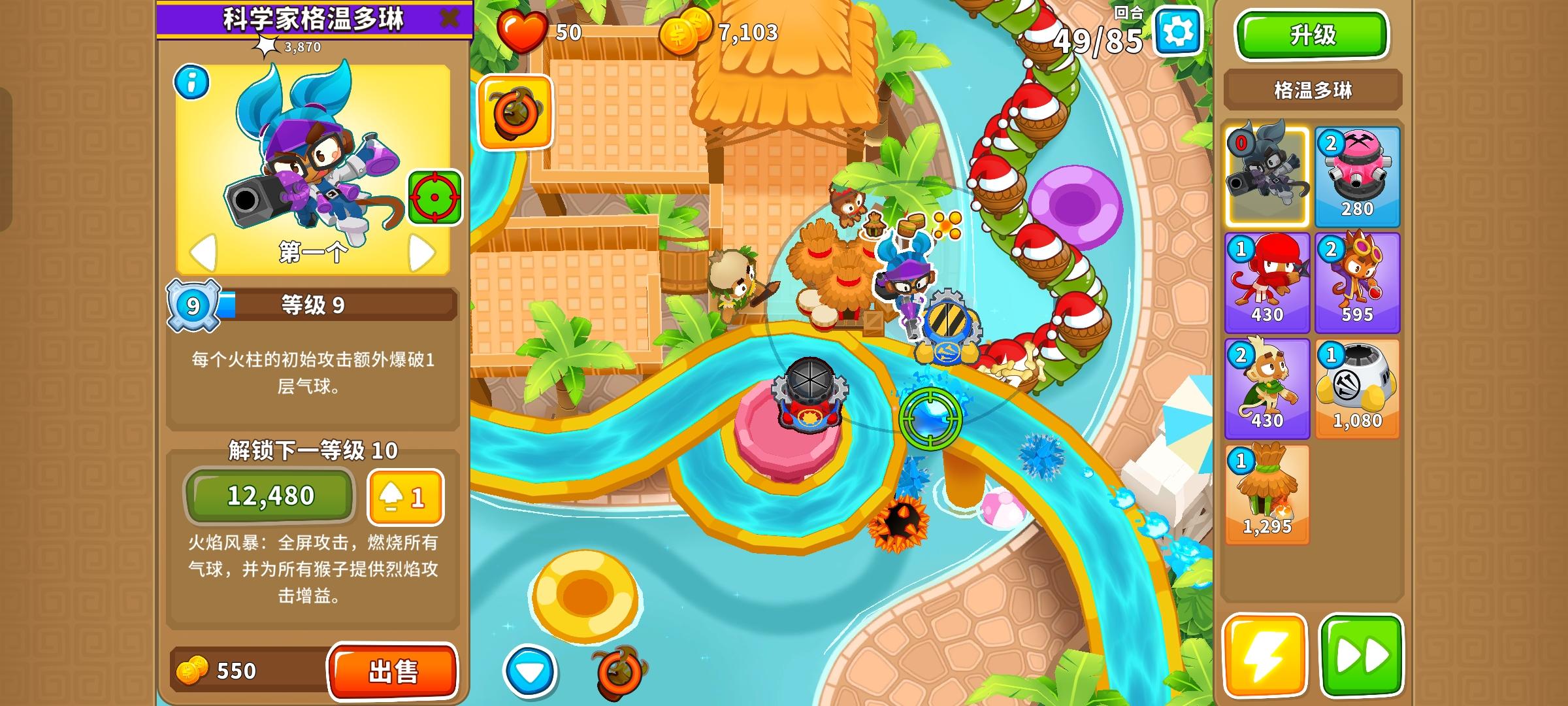 注意050海盗每次技能要拉到两个moab,要在前面的moab马上进家时释放,然后卖掉再买刷新技能cd。最后多一个moab用7级本杰明收尾。