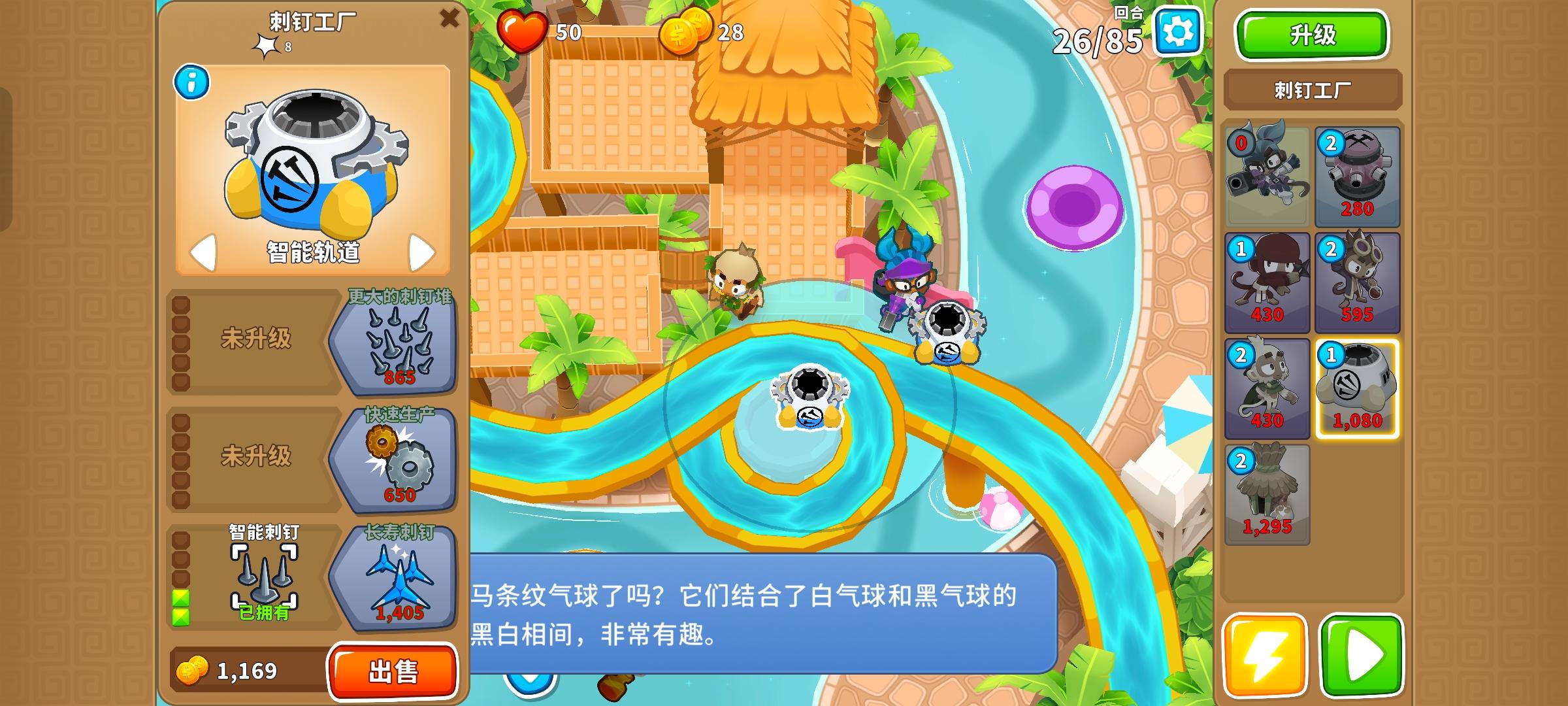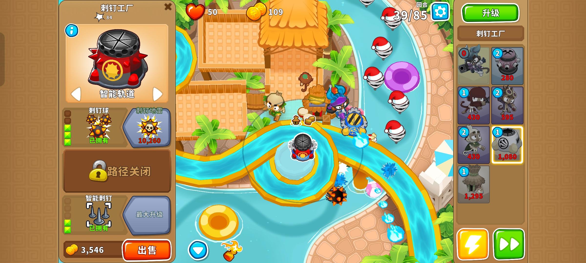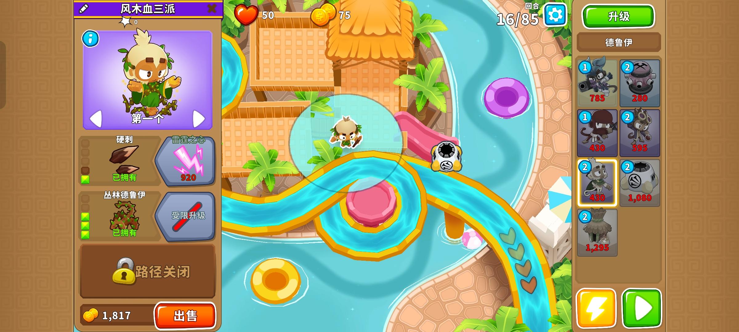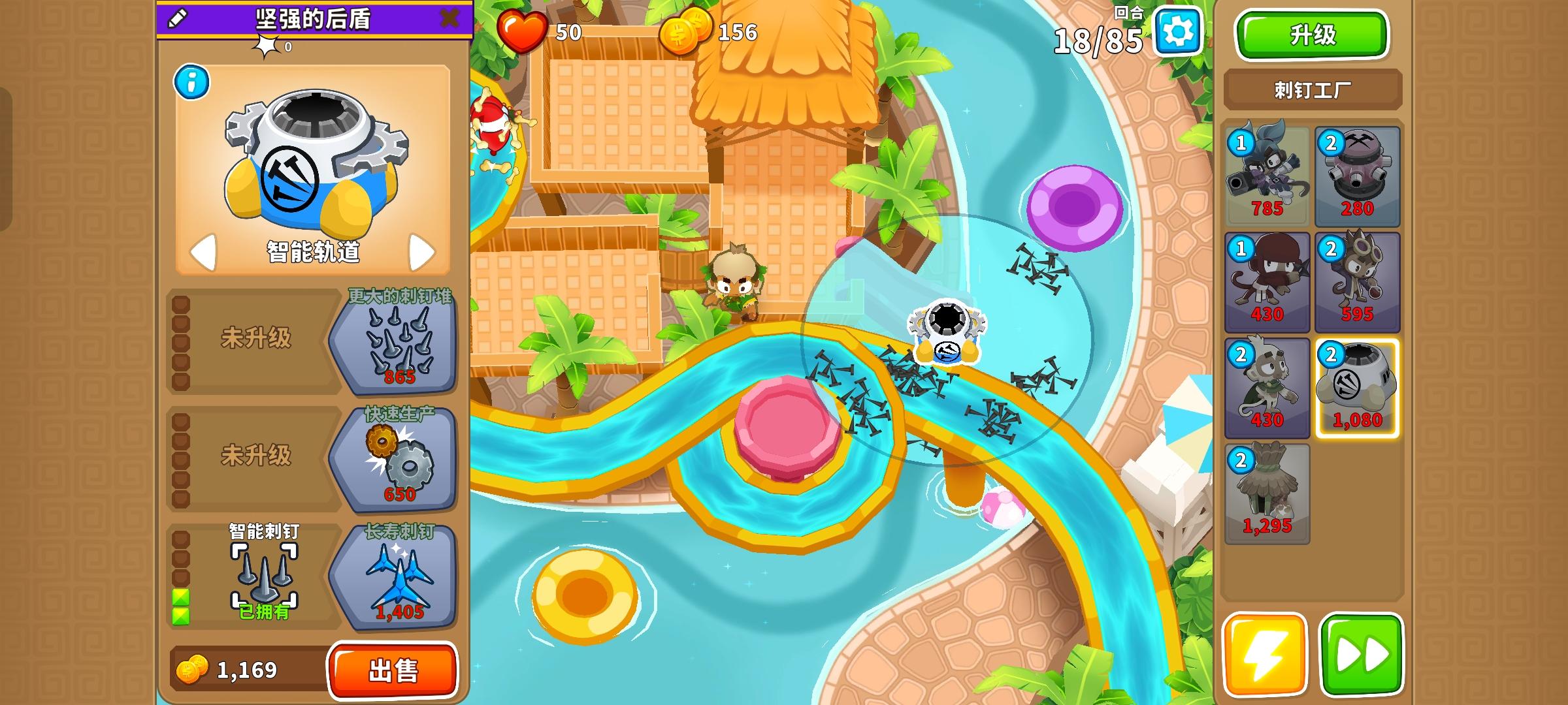 这关就能展示丛林德鲁伊和智能刺钉的神力,无需知识,力量和双金。开局在图上位置放下130德鲁伊和刺钉工厂,优先升级刺钉工厂至002,再放下格温多琳。之后在下方台子上的右上角处再放下002刺钉工厂,最好能吃到格温多琳的烈焰增益效果,吃不到也没关系。再来个202猴子村覆盖所有猴子,先把右侧的刺钉工厂升到003,并把下方的刺钉工厂升到302,好对付MOAB,之后就要憋出203猴子村了,第47回合需要