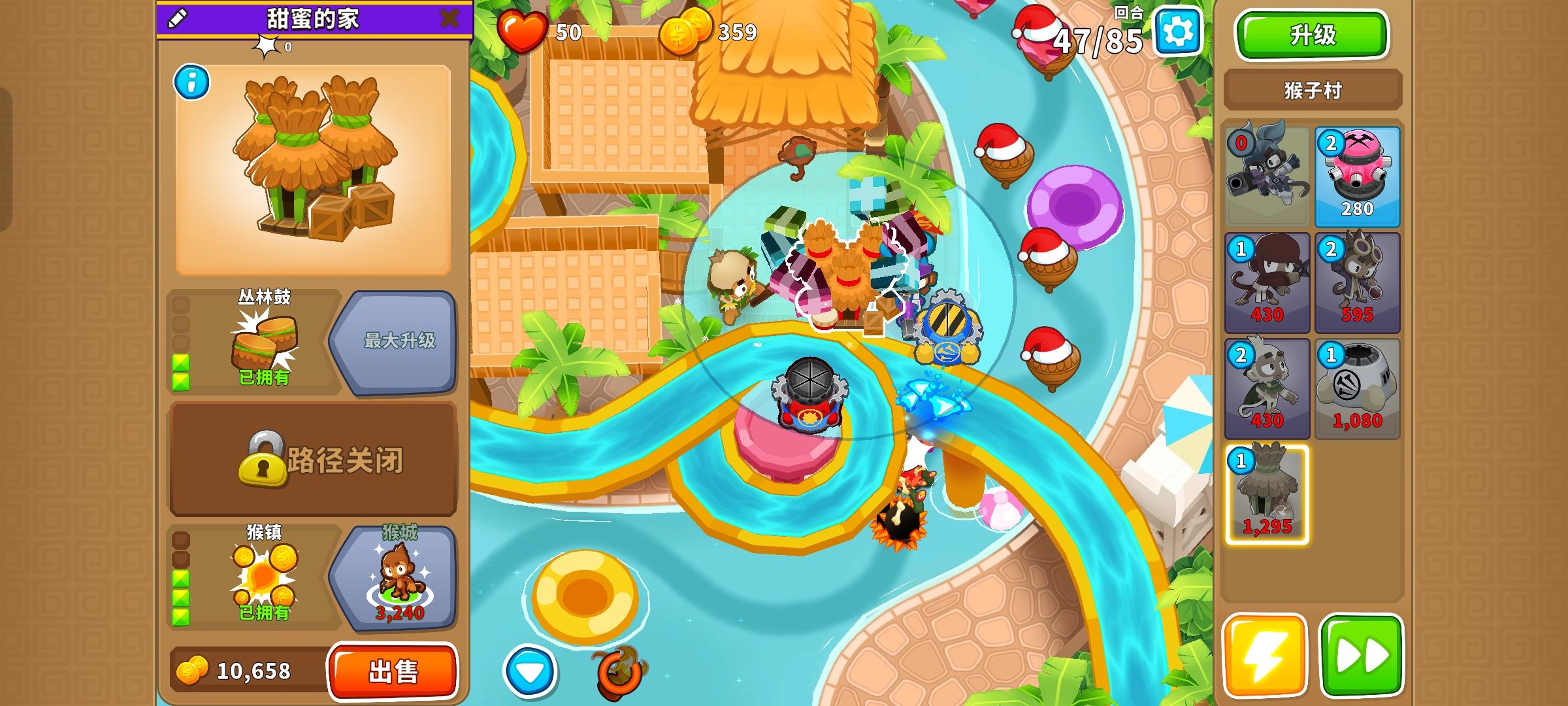 也是受猴友们启发去找精英充气机刷钱了因为是高级的八阶段充气机,为了保证战力上了之前刷钱拉的真太阳神,中路刺钉地毯顶掉一些复仇气球,还有一个缩小版国土防御。不过还是得不忘初心,剩下的位置刷了三个比较给力的加钱猴子(真能刷到加钱飞机还是挺惊喜的)。加上警长套装这套总共加钱40%,Boss战直接堆在一块,甚至连警长都不用上,迫击炮的落点也不用改,只需要不停点国土防御就能过了。还是不需要