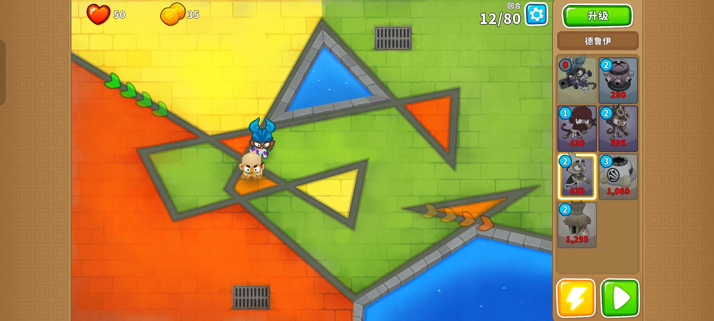如图所示摆放204超能猴和502回旋镖猴,第100回合,通过超能猴的技能分别挑战到这几个位置,应该能通关#气球塔防6 #高级挑战