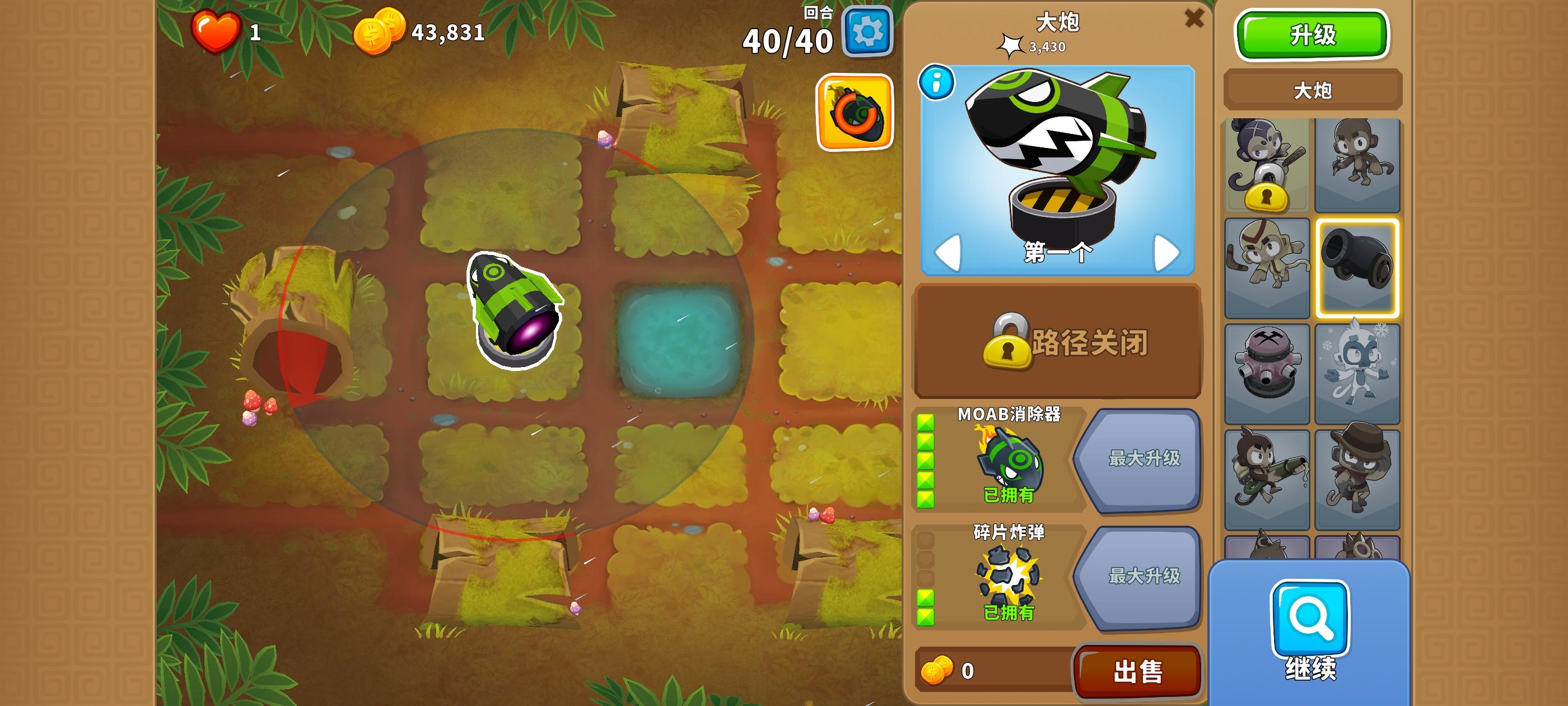 这关因为气球速度较快导致开局比较难,因此细节更为重要。无需知识,力量和双金!开局在眼睛的最左侧放下110海盗猴,并在上方夹角出放下毛毛来开局。第15回合后打开眼睛,钱够了马上放下英雄艾蒂安,并在旁边先放下010德鲁伊来输出。第22回合开始后用艾蒂安的技能,这样同时也能解决第23回合。也需要升级海盗猴至210。第24回合结束后卖了海盗猴,并把德鲁伊升到130来放心通过,且钱够了毛毛也要升到0