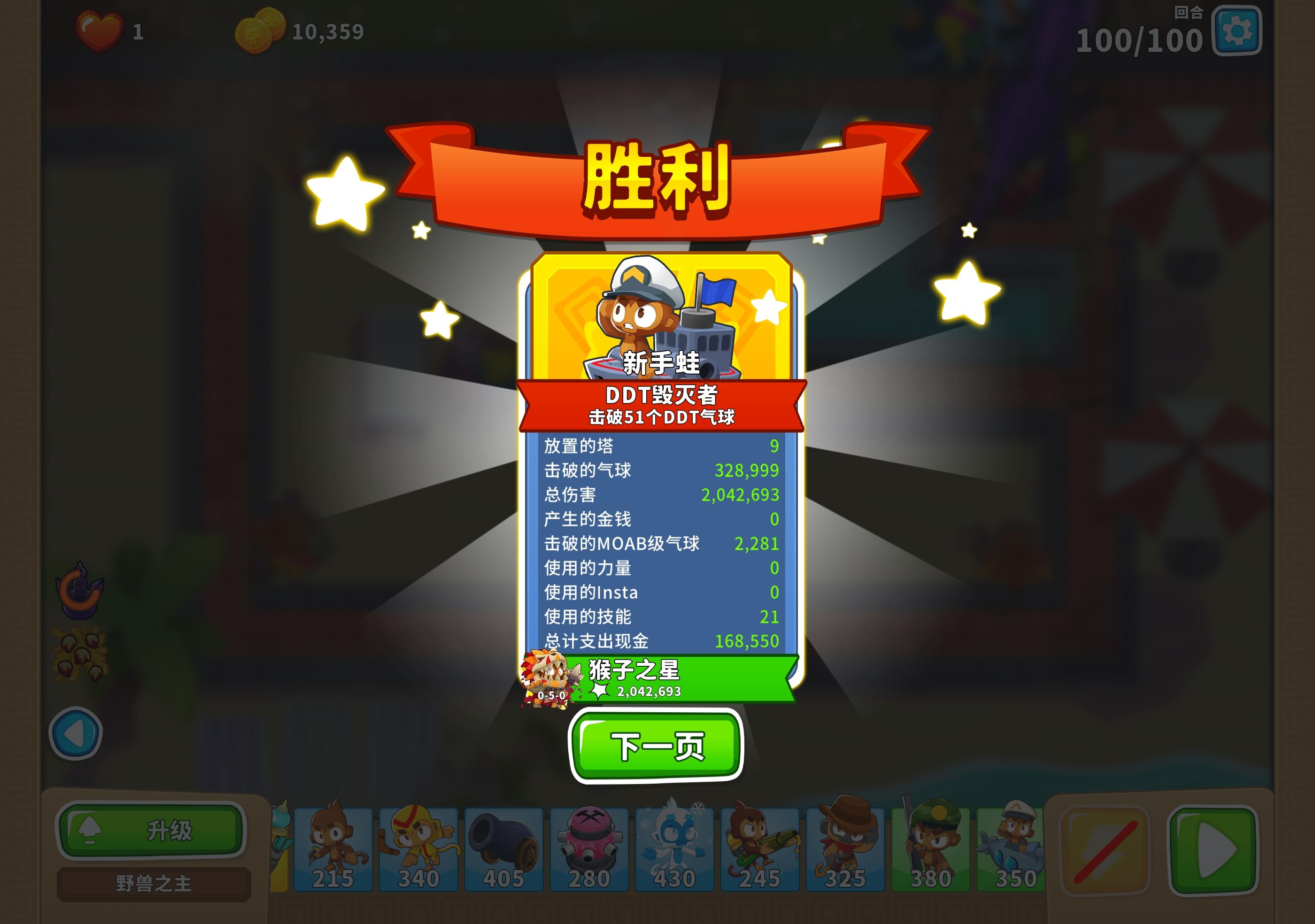 也是受猴友们启发去找精英充气机刷钱了因为是高级的八阶段充气机,为了保证战力上了之前刷钱拉的真太阳神,中路刺钉地毯顶掉一些复仇气球,还有一个缩小版国土防御。不过还是得不忘初心,剩下的位置刷了三个比较给力的加钱猴子(真能刷到加钱飞机还是挺惊喜的)。加上警长套装这套总共加钱40%,Boss战直接堆在一块,甚至连警长都不用上,迫击炮的落点也不用改,只需要不停点国土防御就能过了。还是不需要