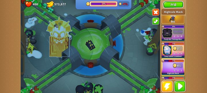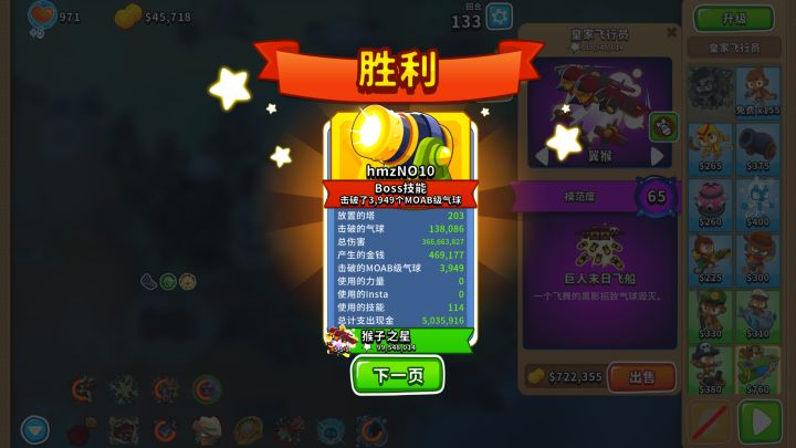 也是受猴友们启发去找精英充气机刷钱了因为是高级的八阶段充气机,为了保证战力上了之前刷钱拉的真太阳神,中路刺钉地毯顶掉一些复仇气球,还有一个缩小版国土防御。不过还是得不忘初心,剩下的位置刷了三个比较给力的加钱猴子(真能刷到加钱飞机还是挺惊喜的)。加上警长套装这套总共加钱40%,Boss战直接堆在一块,甚至连警长都不用上,迫击炮的落点也不用改,只需要不停点国土防御就能过了。还是不需要