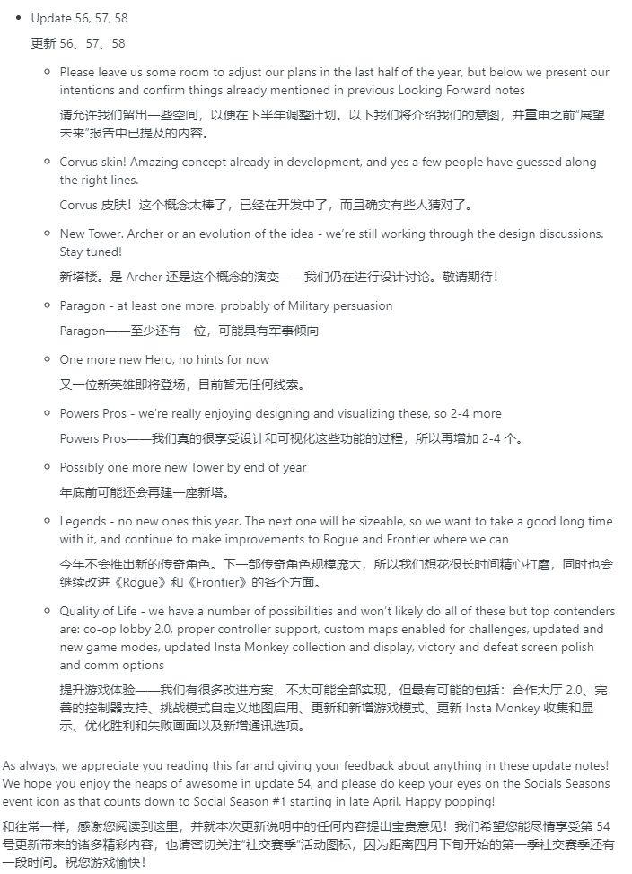 国际服54版本已更新,公告里显示今年剩下的四个版本会有2个新英雄,1-2个新塔,1个军事模范