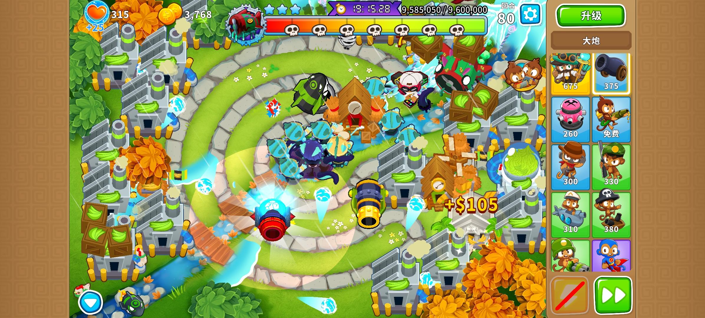 注意050海盗每次技能要拉到两个moab,要在前面的moab马上进家时释放,然后卖掉再买刷新技能cd。最后多一个moab用7级本杰明收尾。