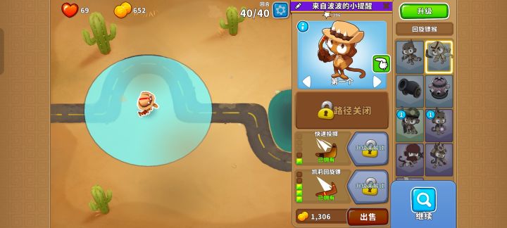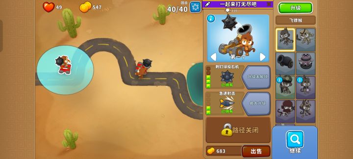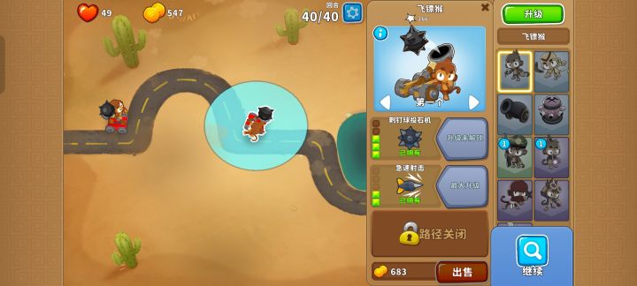 如图所示放置103回旋镖猴,然后有钱就升203,另外一种就是两个302飞镖猴,#气球塔防6 #高级挑战
