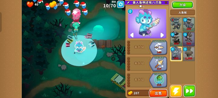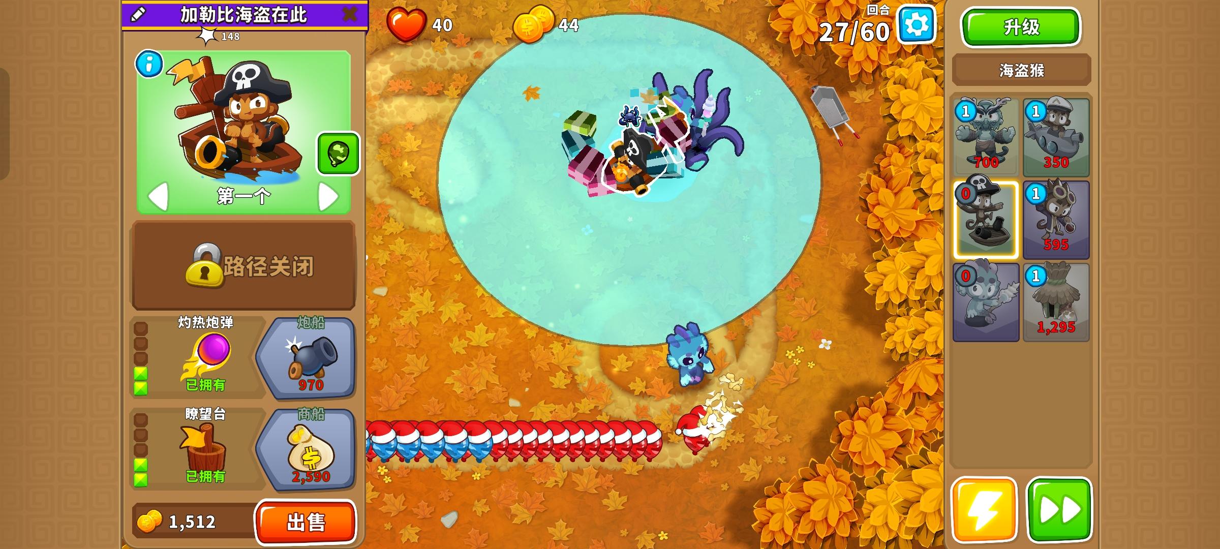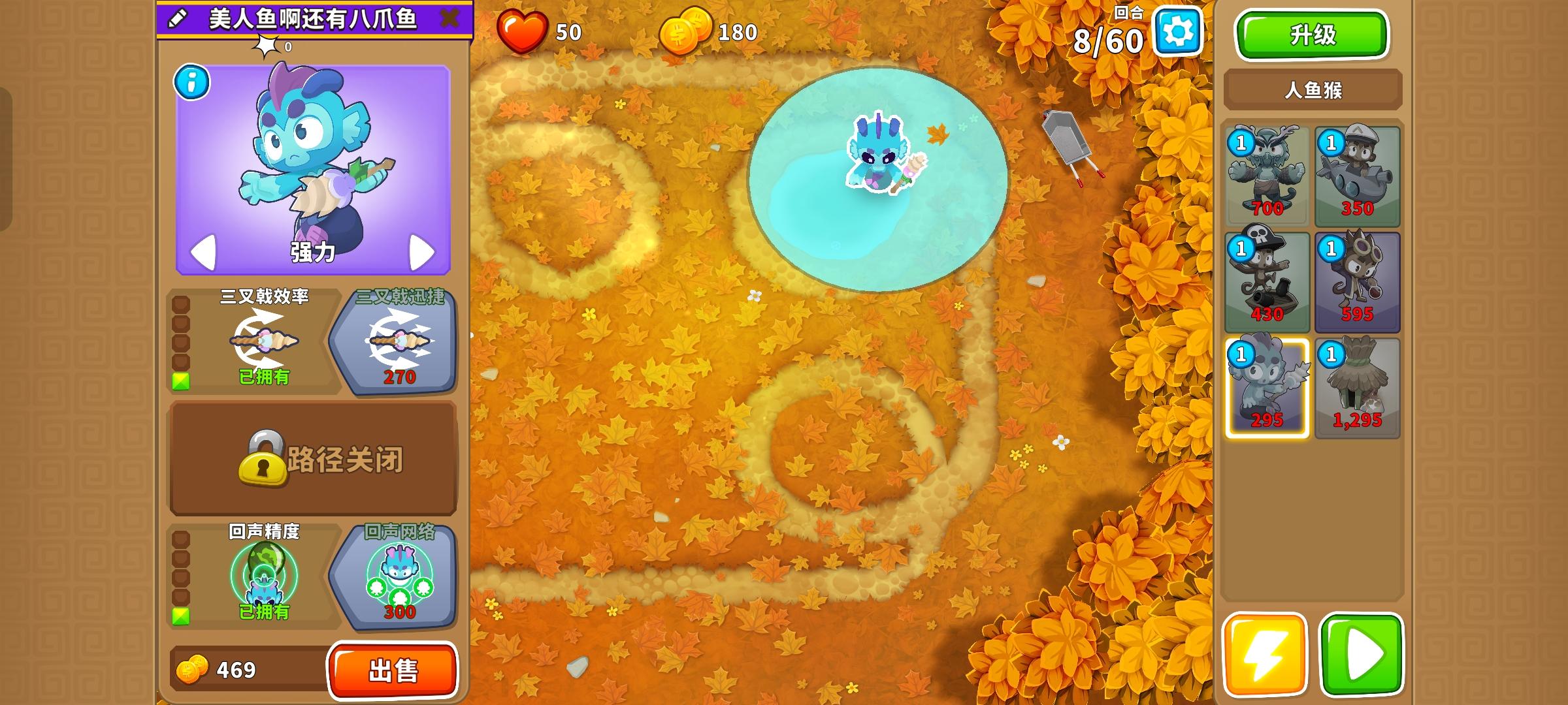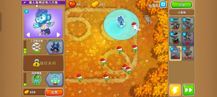 这次的困难征程确实比较难,不是气球速度快就是开局钱不够,而且运气也非常重要。只要生命不归零就行,必要时通过SL来减少损失的生命!无需知识,力量和双金!带上英雄奥本,猴子潜艇,海盗猴,2人鱼猴,炼金术师和猴子村就行,无需其他猴子!岛1:因为都是迷彩气球,开局在图上位置放下101人鱼猴,钱够了升到201。然后在这里再放下001人鱼猴,钱够了也升到201。必要时目标改强力!之后把上面的人鱼猴升到30