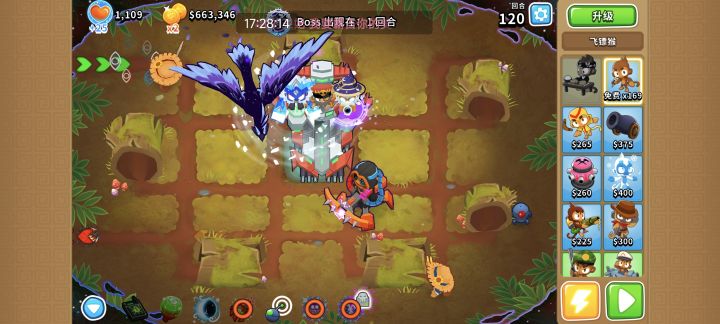 本期的boss700%的生命值,有没有被吓哭呀?考虑到可能很多新玩家都打不过,所以本期来教你们怎么打boss。英雄选择杰拉尔多。第一回合给了1万的启动资金,如图摆放。先建造减价村000在减价村的范围内放置制作一个230香蕉农场,放置杰拉尔多,购买昆西手办。然后建造203香蕉农场,直到11回合(过程中可补1~2把弩)r11银行里面的钱存满了,出售昆西手办,香蕉农场,在猴村左右两边建造两个