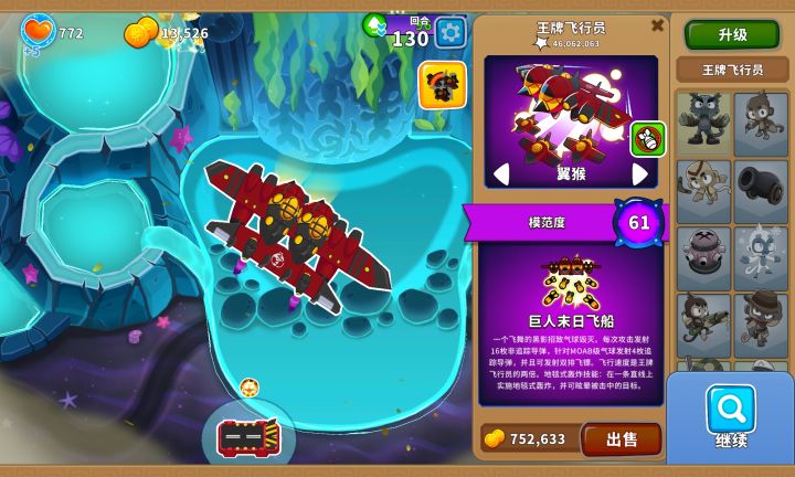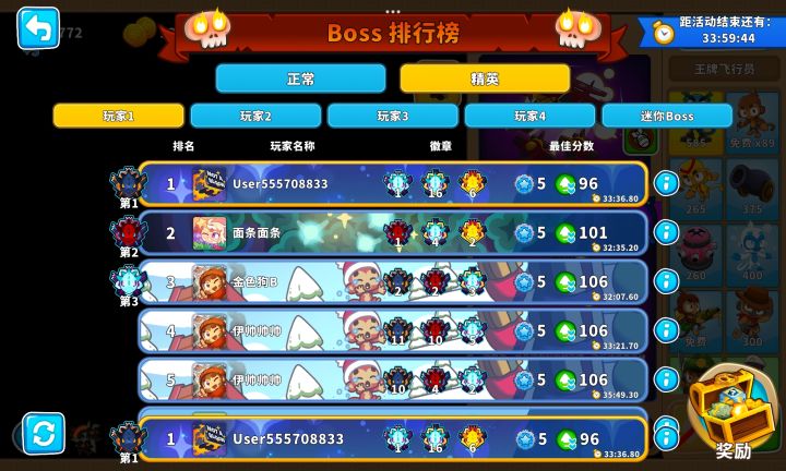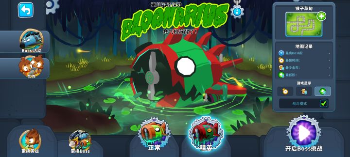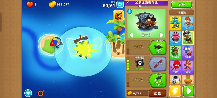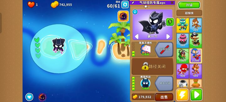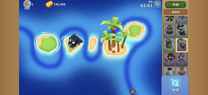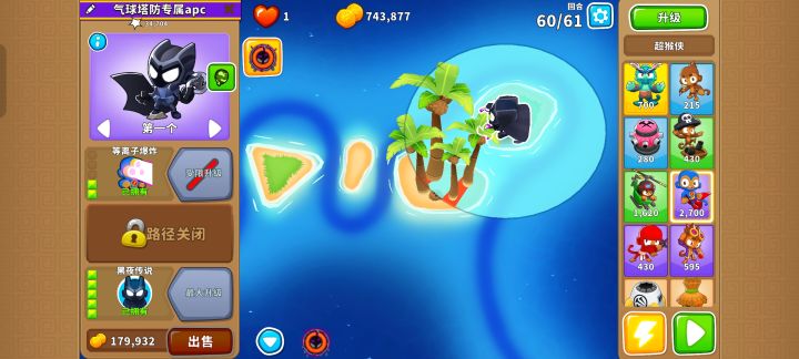 核心输出就是205超猴侠,只要把它放在左边岛上的最右侧,等到BFB离开攻击范围马上用技能瞬移到右侧岛上靠下的位置就行,顺便通过61回合!当然也能简单一点,可以给它200猴子村的增益效果让它无需瞬移技能!也可以先升001超猴侠给气球减速,让040海盗猴钩走BFB,然后升级至205超猴侠疯狂输出!还可以让205忍者猴控制BFB让205超猴侠放心输出!甚至可以让502直升机飞行员或其他猴子来帮忙