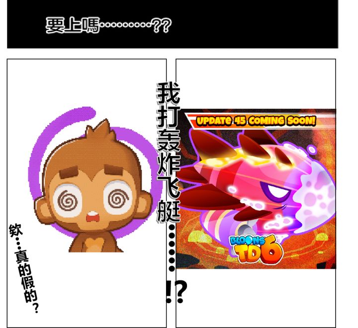 #气球塔防6 各位猴米好 , 近期我们有看到猴米在各平台反馈,关于45版本的更新问题。因此次新版本的更新内容及整体调整较大,版本本身也进行了引擎升级及代码改动,我们目前还在努力爆肝合入当中,争取尽快与猴米们见面! 预计会在10月底完成整体的更新,具体的时间请关注官方账号公告,我们也将在版本更新前第一时间通知大家。 非常感谢大家的耐心等待!(鞠躬鞠躬鞠躬) ※顺便放个新鲜出炉的梗图概