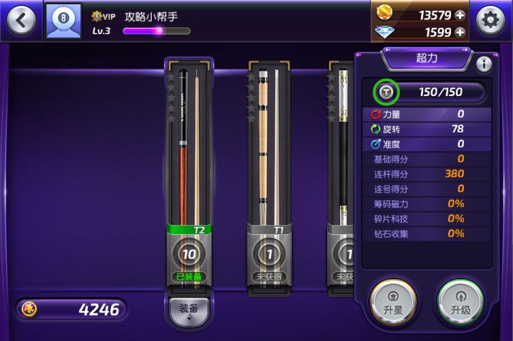 球杆总属性=球杆本身属性+装备部件加成属性球杆/部件属性包含:1. 主要核心类:力量、旋转、准度2. 得分类:基础得分、连杆得分、连号得分3. 资源类:筹码磁力(从称赞中有几率获得更多的筹码)、碎片科技(升级球杆时有一定的几率暴击(球杆等级+1))钻石收集(在俱乐部中获胜,有几率收集到微量的钻石)4. 技术值:球杆调试模式中,可供玩家自由分配给球杆力量/旋转/准度的点数,提升该球杆的