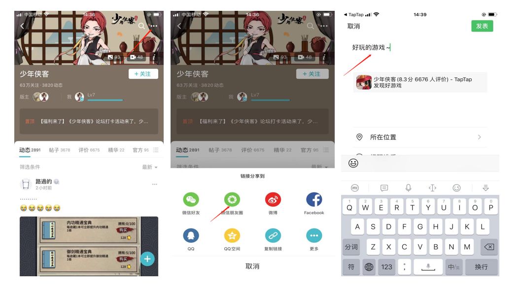 各位少侠大家好! 明天就是五一了, 又是5天小长假,欧耶! 真的超开心! 可以出门度假, 也可以一个人熬最晚的夜, 睡最懒的觉, 真是轻松又自在~ 大家是不是蠢蠢欲动了呢~ 《少年侠客》也给大家送福利来了! 【活动内容】 TapTap打开《少年侠客》,右上角点击分享,分享链接到朋友圈,将朋友圈截图后回复到本帖下方,操作步骤如下: 将此图回复至此帖下方~ 奖励:分享至朋友圈奖励200元宝,200金龟