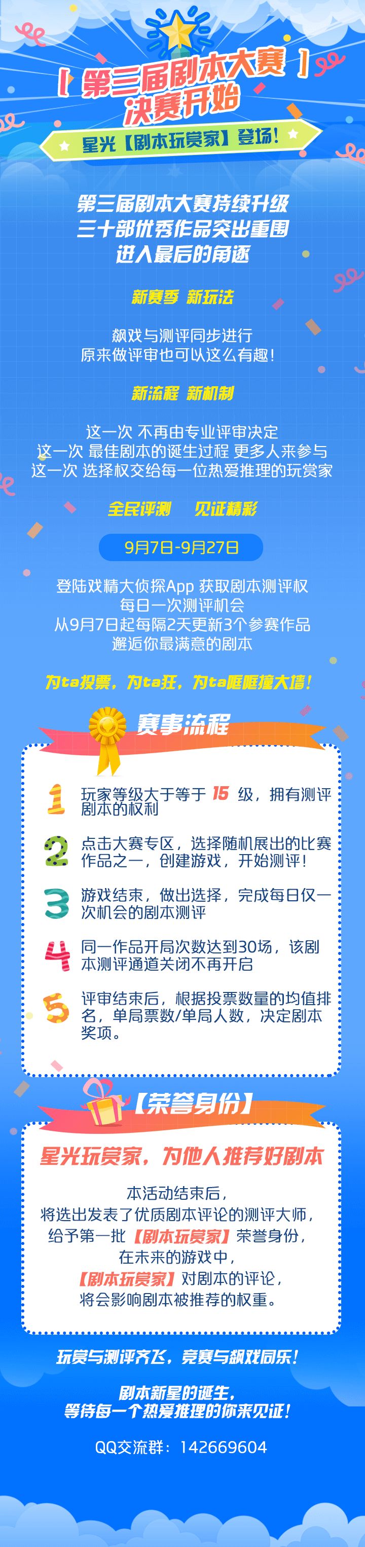 第三届剧本大赛持续升级 三十部优秀作品突出重围 进入最后的角逐 新赛季 新玩法 飙戏与测评同步进行 原来做评审也可以这么有趣! 新流程 新机制 这一次 不再由专业评审决定 这一次 最佳剧本的诞生过程 更多人来参与 这一次选择权交给每一位热爱推理的玩赏家 全民评测 见证精彩 9月7日-9月27日 登陆戏精大侦探App 获取剧本测评权 每日一次测评机会 从9月7日起每隔2天更新3个参赛作品 邂逅你最