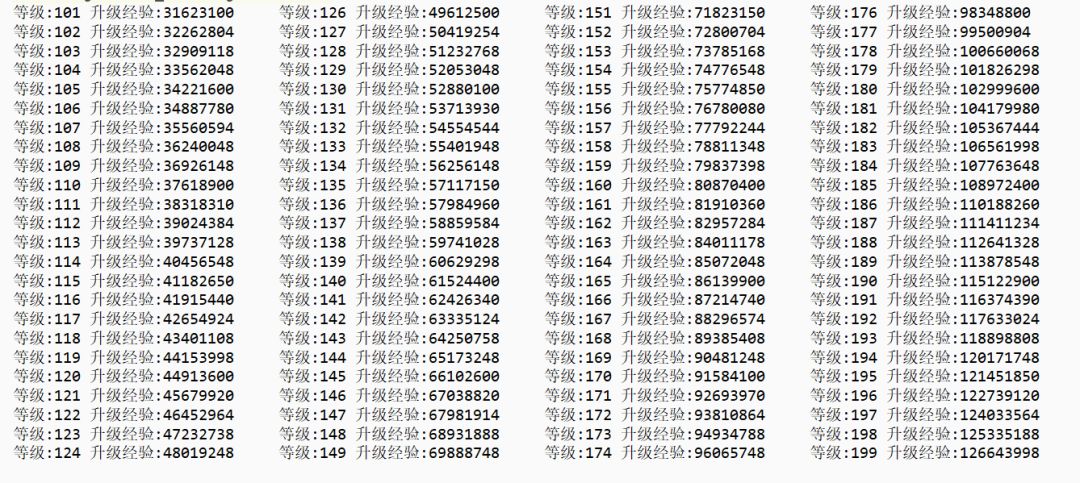 上班划水没事做,弄了下升级经验给大家分享一下。 升级经验是由公式的,101级之前升级经验的公式是n*n*1500,其中n是等级 101级之后,经过一番推导我得出升级经验公式是这样的:32262804+(n-102)*646314+((n-102)*(n-103)*(6612+2*(n-102)))/2;n是等级,n>101 根据这公式,得出以下数据: 图一: 图二: 经常会有人问每天要加速多少次,