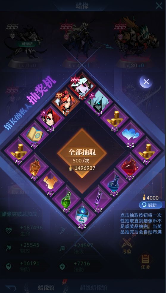 1.简而言之就是前面多屯蜡像币 (比如种田选血精、钻石、蜡像) 2.八转开始用 蜡像币抽蜡像碎片 (前面抽会有红点,强迫症患者可能会手贱升级普通蜡像) 3.超级蜡像馆消耗的是 蜡像碎片和羁绊值 (羁绊这个货币都是溢出的,所以不用刻意囤货) 4.超级蜡像馆 会在每次转生后清零 【蜡像币和蜡像碎片不清零】 (7转开始,每次转生前屯三百万蜡像币) 5.八转很肝,祝各位救世主体验愉快! (八转推图新觉醒怪