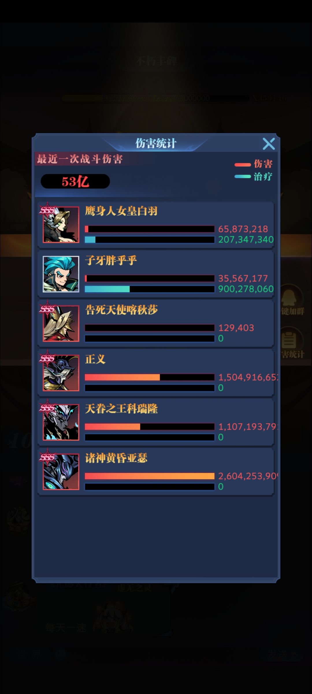 适用高转,七转以上及七转 全员1400w血 阵容一:白羽,正义,天眷,亚瑟,告死,男主带吸血三输出打八回合 阵容二:白羽,正义,亚瑟,告死,鸟人,男主至高打十回合 八回合三输出会比十回合两输出伤害高一点点 我七转的时候就打出49亿伤害了,装备词条和等级能相差19亿伤害,目前只有八转200级,装备还没弄好,凑合能打53亿,预测八转能打上65亿伤害