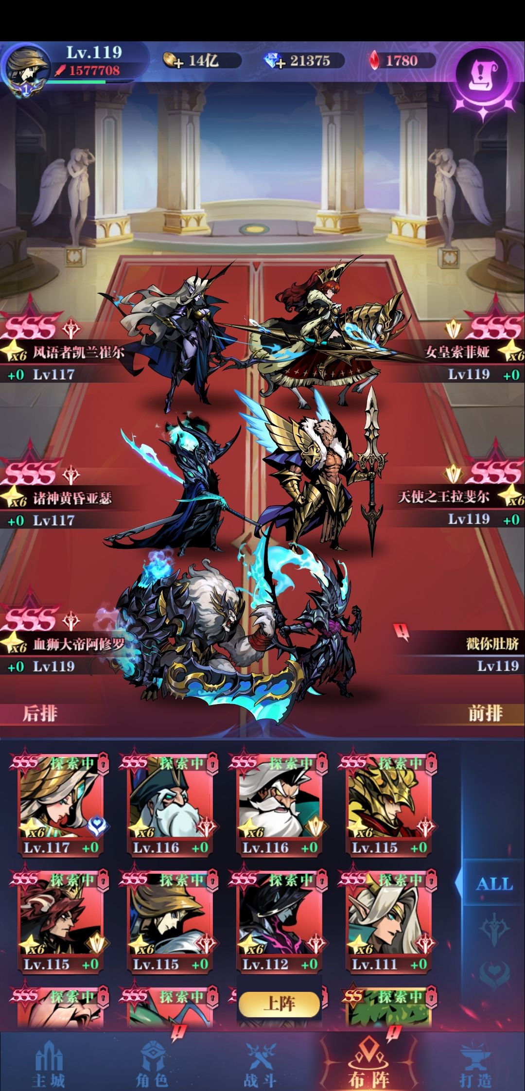 推图角色:元素,海拉,色欲,铁壁+3,懒惰,朱莉,正义+3,天使 铁壁和朱莉共用两套装备,比命邪和辉生命。 铁壁比命邪一血一防一速,辉生命尾血一防一速 朱莉辉生命尾血尾防尾速。 主角技能带单沉默。 #古代战争
