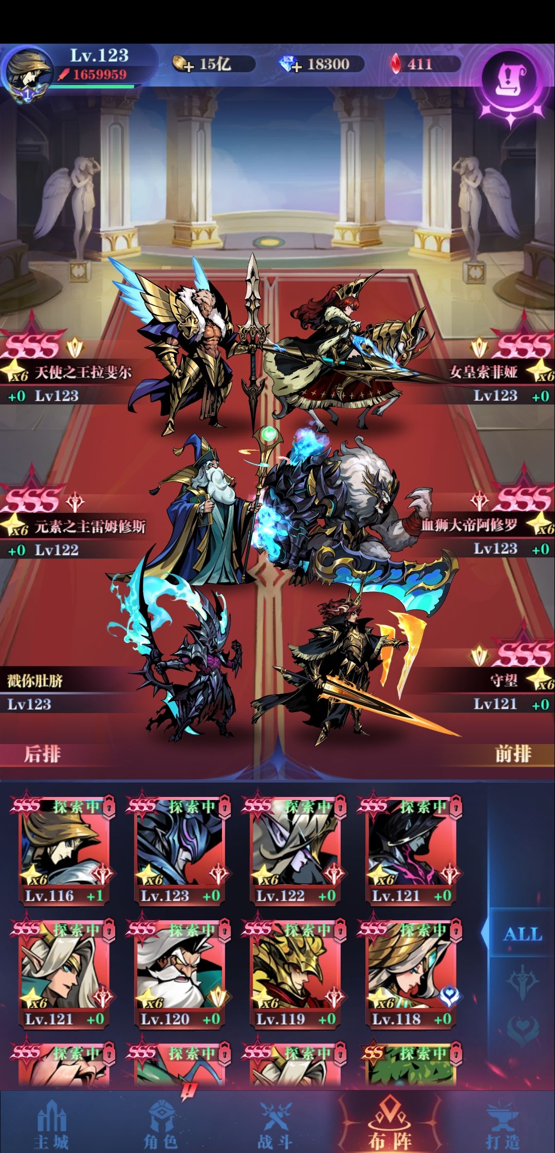 这是参考大佬们的攻略整合成精华自用的,方便自玩时查阅! 抽卡顺序:怜悯,海拉,色欲,天使,元素。血狮(过高伤脆皮图),悠悠(解决对面控太多情况),恶魔大祭司(配合血狮打暴怒),铁臂-懒惰-朱莉(后三张一转29图常用,也可组成恶魔队)。抽到后用5张ss把sss升到6星,解锁4羁绊和强化,天使先不开羁绊也不强化,怜悯进阶+3其他不用。 前期:前排索菲亚(解锁1个羁绊)/阿姆(解锁1个羁绊)、男主、大树
