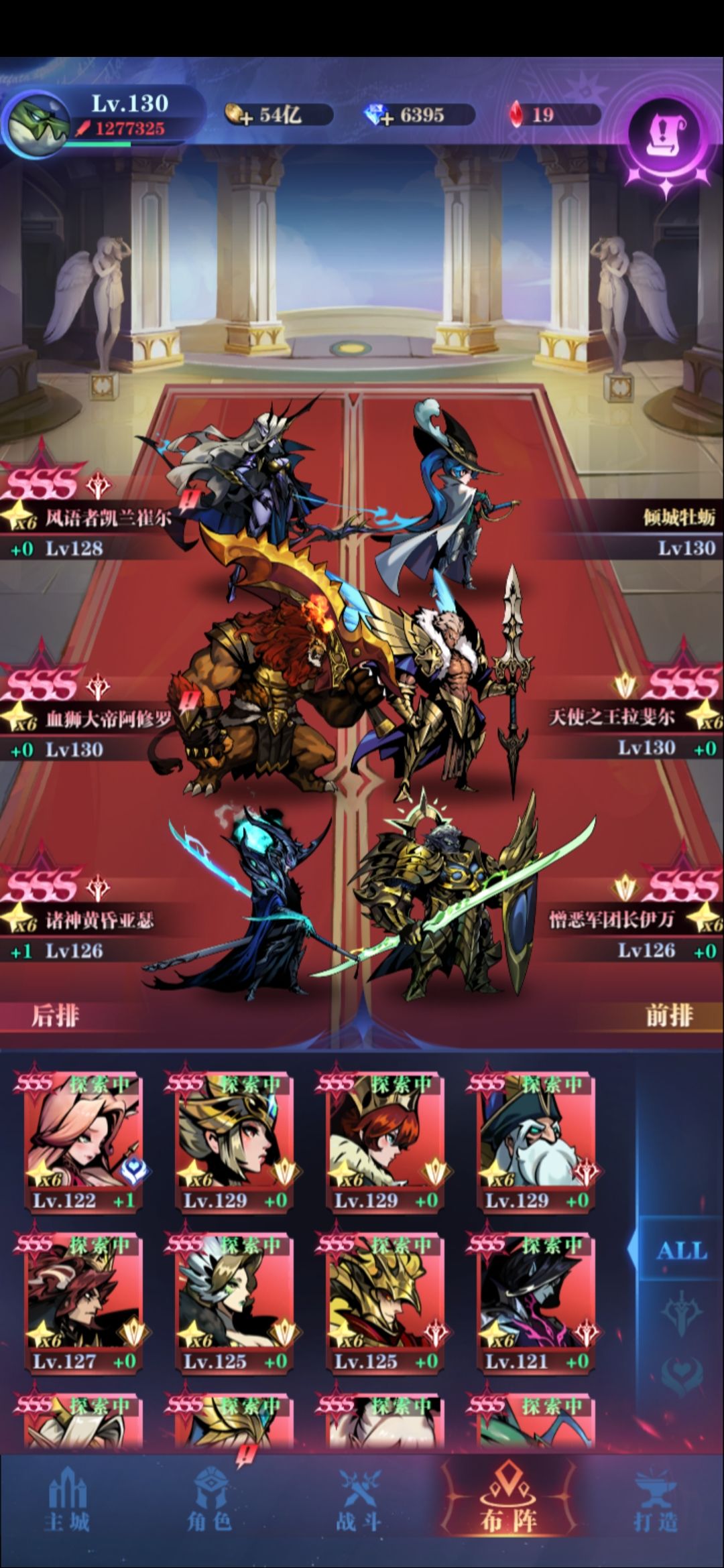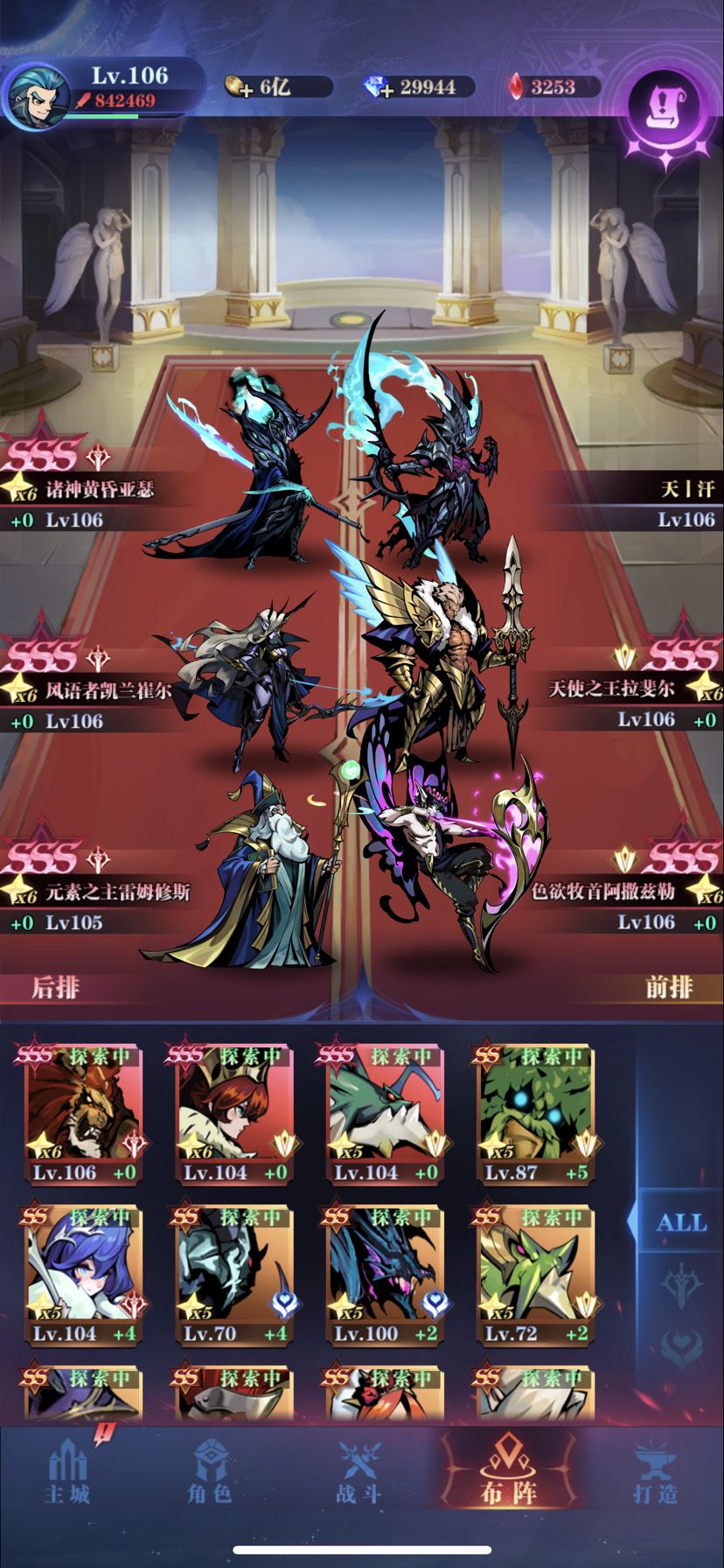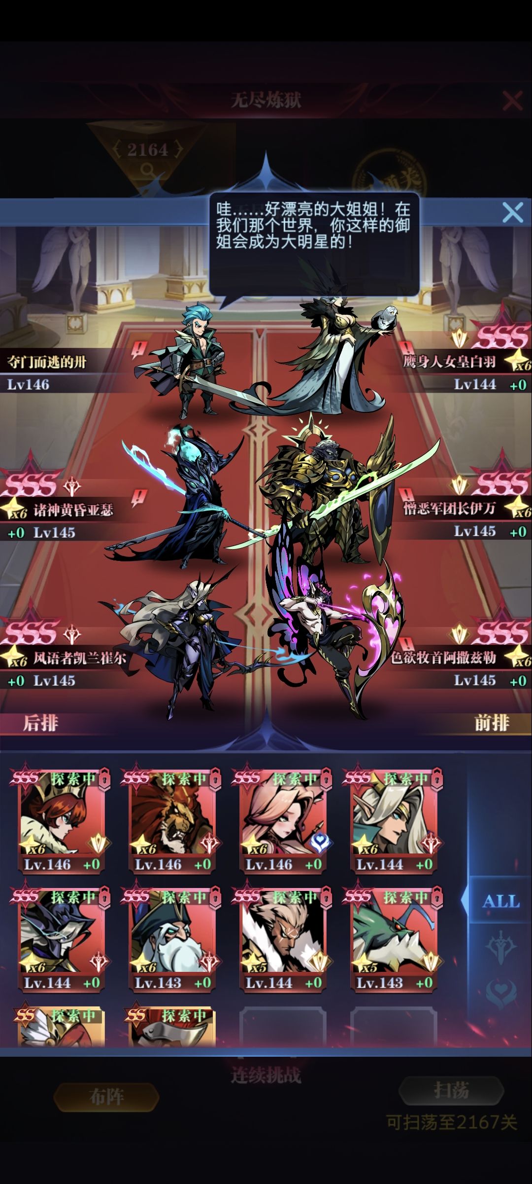 随缘留点作业,站位如下图,属性细节我讲一下:血量前三男主天使圣光,物攻前三圣光天使狮子,尽量做到男主第四女皇第五守望第六,男主慢速天神被动晕(ps:此攻略适用于极限推图,号主加速多所以等级高,对于110级左右的人,不睡觉也可以过,不过男主主动要带加攻,所以全靠女皇刷脸控一轮后排,过关率要低一些,反正我每次110多级推零转这个图都过了😏)