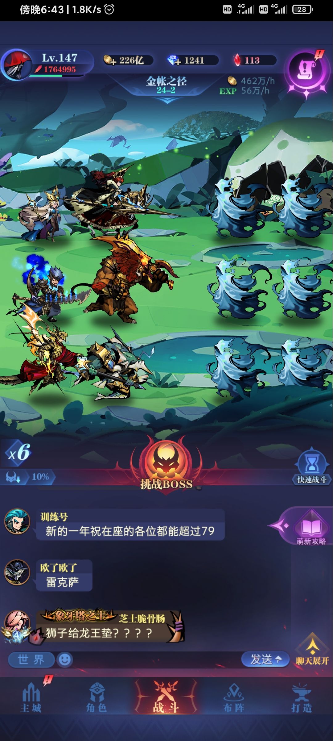 很多人都说过15晨曦必不可少,其实有诺诺或者锻造也差不多,不过有晨曦的话要求可能会低一点。狮子要求31w攻以上。 上阵五人,看龙后技能是打防御最高的四个所以需要把诺诺或者锻造防御降到第五之后就行,男主单技能带加攻,然后刷脸狮子六连爆。