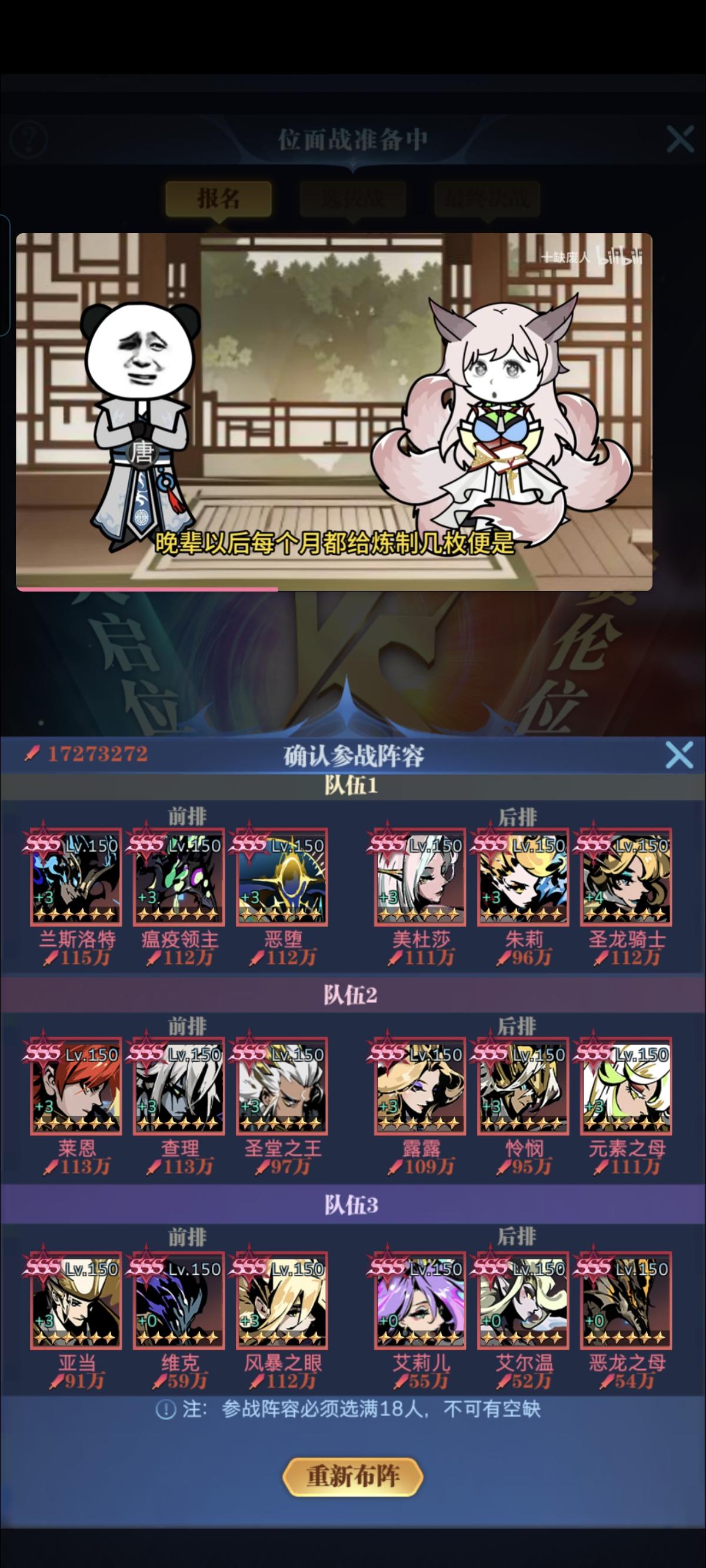 原来手机发帖可以在帖子里面加视频啊,我才知道7转图我亚当推的有点尴尬,因为装备问题,导致基本到了30图以后就是亚当,朱莉,四轮3个队伍轮流上,有个图甚至把打BOSS的亚瑟都拿出来了,6转收菜期间总是等级过了才想起来装备没做,导致伤害缺口有点大,血量也差点意思经常刷脸赌那一丝丝伤害差才能活下来,反倒是血战的装备没忘记,有点尴尬。7转亚当推图大体来说和6转没什么太大的差别,不过多了几百张如3个狮子