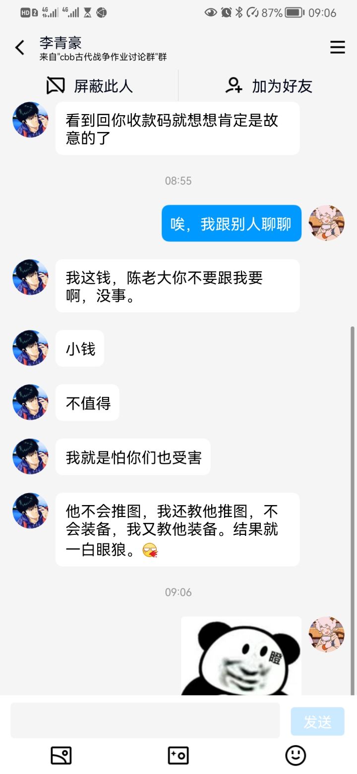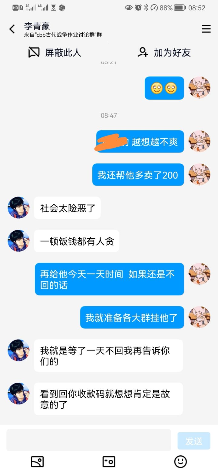 今天发现了个老骗子,有三骗(豪哥帮忙推图打血战还被骗68。初见跟他聊天有了轮船骗感情还有两个五转号。骗取我的信任帮他卖号)真是罪大恶极,具体如图。(特别提示:如果有人买号被骗了 可以来找我)