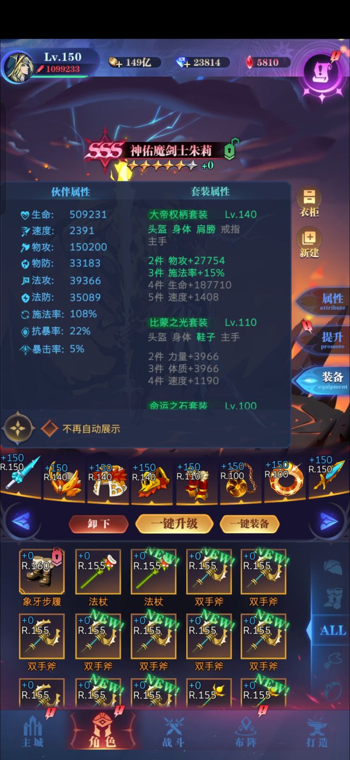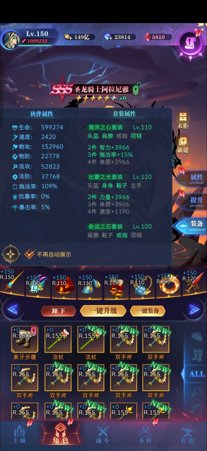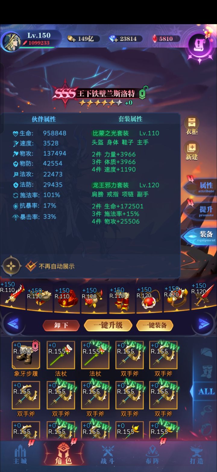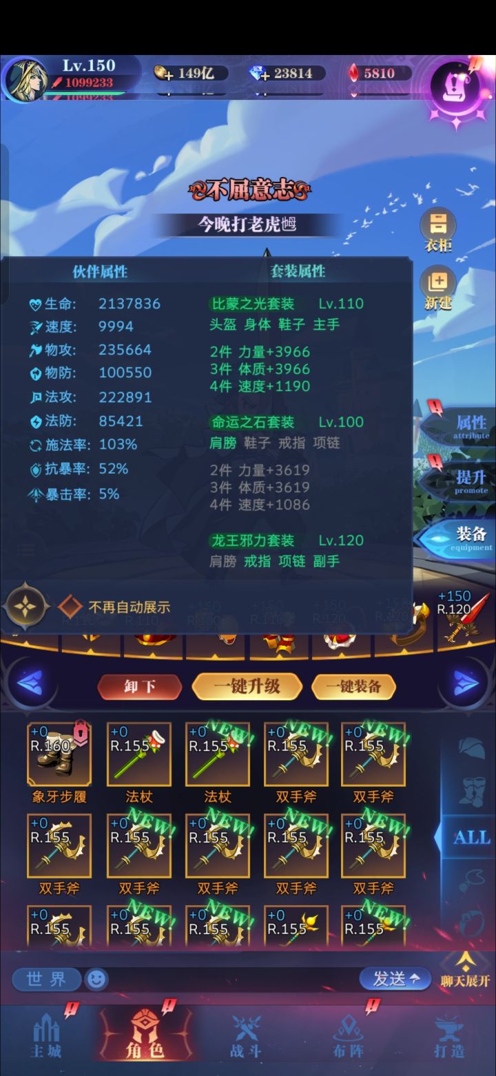 终于120亿了。+6龙骑满助战。狠下心给主角抽了满助战,能扛住圣光的两次秒杀,帮助告死活到第九回合。主角属性如图,在1500w血的情况下,需要至少436w法攻,才能扛住两次秒杀。接下来想提升只能给刹帝利抽卡了,但是没血精了,且担心抽完不久后出上位替代。 #古代战争 #古代战争世界boss