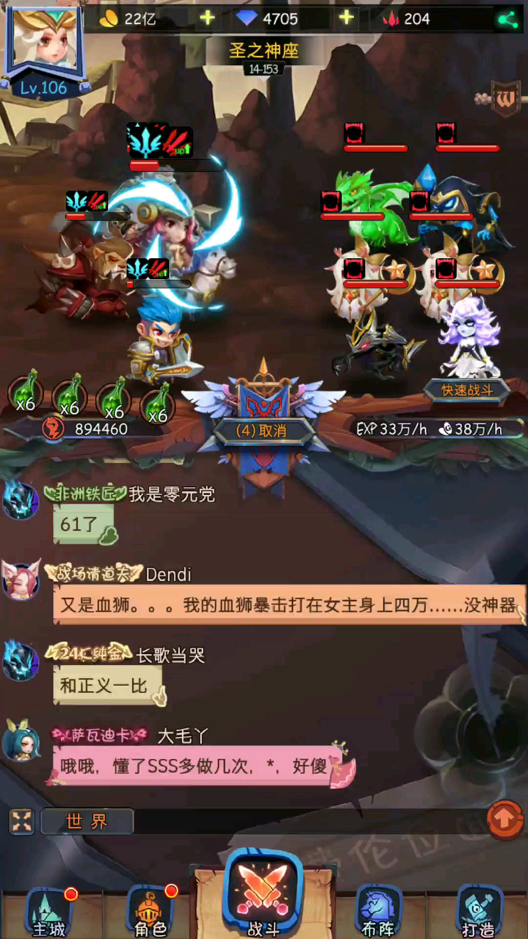 出手顺序为男主-莎莎-星辰-翼人-血狮子,法师队奶量很足,在每回合回满的情况下后排的的血狮可以很快获得较高的加成,满暴击的情况下在大部分图能配合莎莎清场,即使有前排全部退场的情况,保留复活的血狮依然能和莎莎打出最后一轮输出,泛用性很强。。