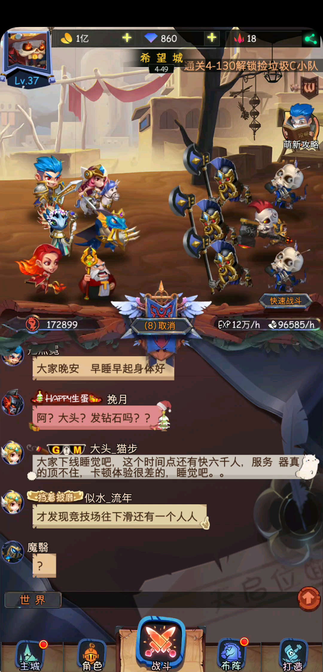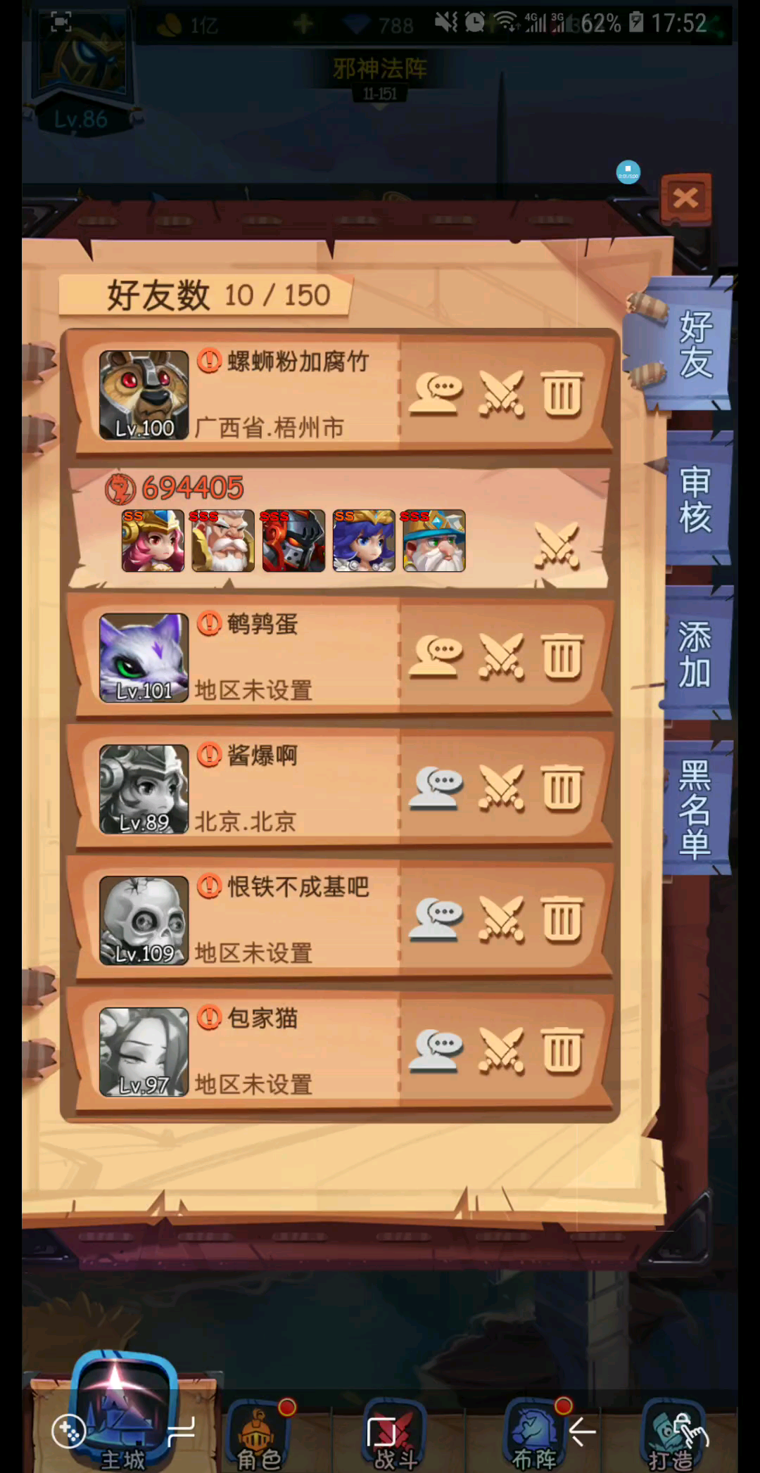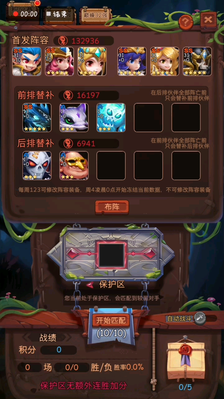 欢迎大佬们点评,这几个备用英雄的羁绊我是全开的,都是+0,我+3女主和十万攻击的正义打了几次没看到希望,元素老头脸黑抽不到,就用这个阵容夯了大概五十把。