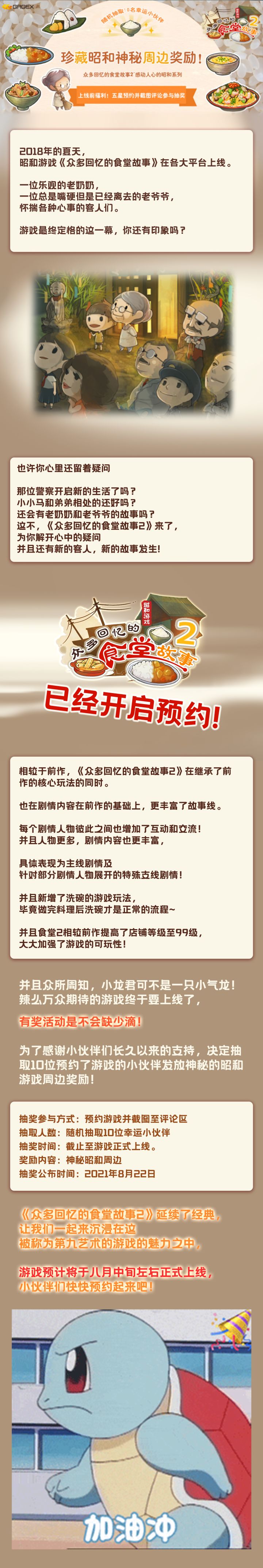 《众多回忆的食堂故事2》预约已开启,小伙伴们快来预约抽奖呀!小伙伴们只有从《2》下的帖子这里进入留言截图,才算参与抽奖哦~喜欢识君与小龙君的小伙伴们可以添加小龙君的QQ粉丝群:834879683里面有许多志同道合的小伙伴与大方的小龙君不定时发放的小福利~快来加入我们吧!《众多回忆的食堂故事2》预约已开启,小伙伴们快来预约抽奖呀!