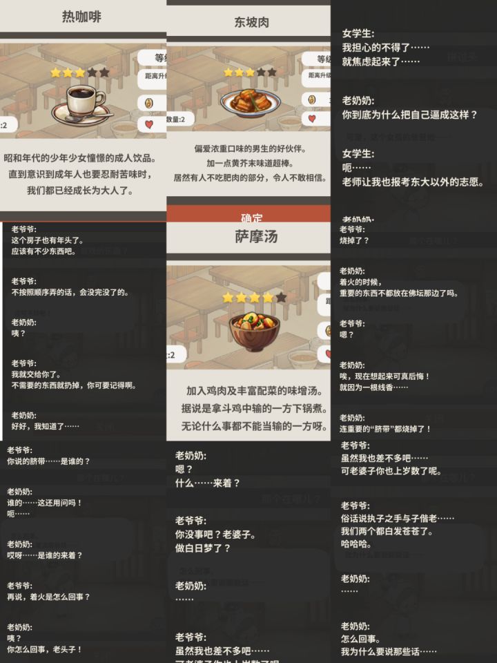 「人生啊,不过大梦一场」(好奇怪这个我本来以为是哪一部的另外一个名字,但下载下来发现确实是新的故事,界面排版美工介绍和游戏玩法乍一看就是食堂一,差点退出去,可剧情场景和一些人物又是陌生的,多了个收藏界面,而且这家店是老爷爷做饭老奶奶辅助(居然是爷爷做菜,那所以奶奶是后面才学会的?是了,后面爷爷叫奶奶自己学一学,以后能用上),感觉可能是新出的回忆食堂系列前传)🧵【图2】时间线好像是在老爷爷去世之