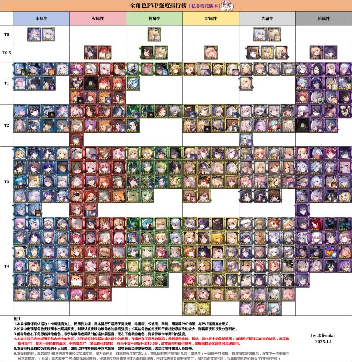 写在前面1.简单做了一份图,懒得加花里胡哨的半透明立绘背景了,将就着看吧2.尝试了新的表现方式:将需连体角色置于该卡右下角以表明其连体强度,不连体单用时另外标出,不知道这样会不会影响整图观感,下次再改进3.有事先看下面六行附注4.图中没有标注各角色名称,对游戏不熟悉的萌新可能会有一点阅读难度,对此建议根据部分头像编码,善用图鉴-属性筛选、角色-兑换-时装-属性筛选来查阅想知道
