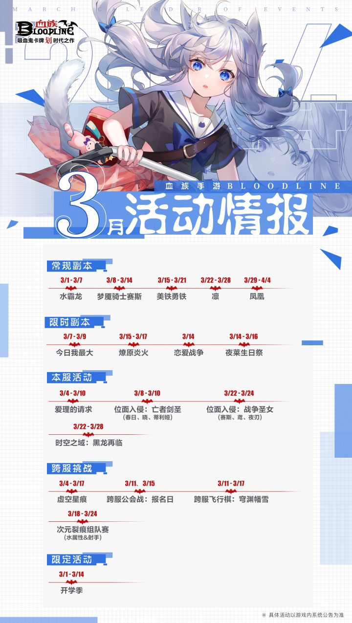 血裔宝们好呀!3月悄然而至,新学期又要开始啦,血裔宝们准备好迎接开学了吗?开学特供福利以及全新角色来袭,具体请看下方福利报道!开学季活动时间:3月1日05:00~3月15日04:59活动内容:1、活动期间内,每日登录游戏和完成指定数量每日任务,可分别获得“知识礼盒”和“早读印章”;2、“知识礼盒”可在道具背包中使用,有概率开出七彩盾菇、召唤卷轴、法塔能量、命运币等游戏道具;3、累计