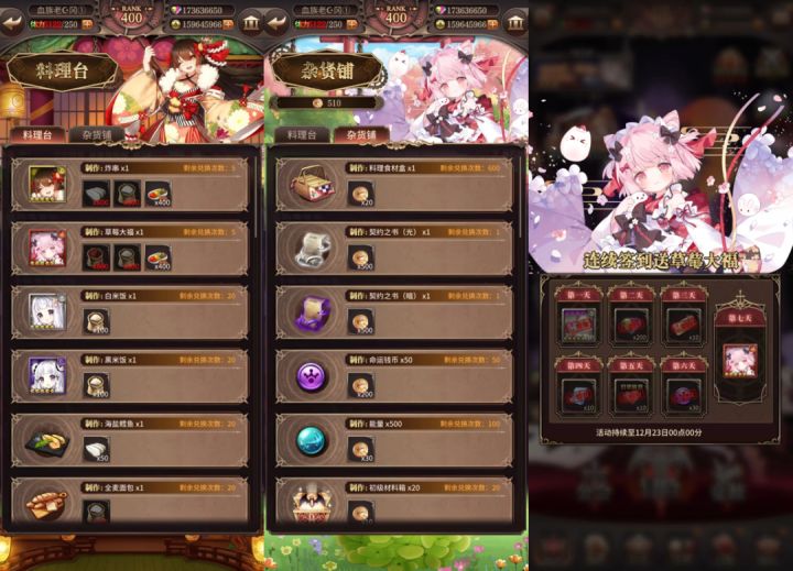 客官们都吃上热乎料理了吗?在享用美食的时候餐桌礼仪和最佳品尝姿势必不可少!这就带大家来看看关于【舞姬的宴席】一些小细节~【舞姬的宴席】文字攻略:本期活动分为主要由以下几部分构成:1、获取食材在料理台中制作【炸串】、【草莓大福】等角色卡牌;2、赢取“宵宴铜币”,在杂货铺中兑换各种资源奖励;3、完成七日连续登录,领取五星角色草莓大福一名。注:不同角色兑换时所需的食材种类及数量均存在差异