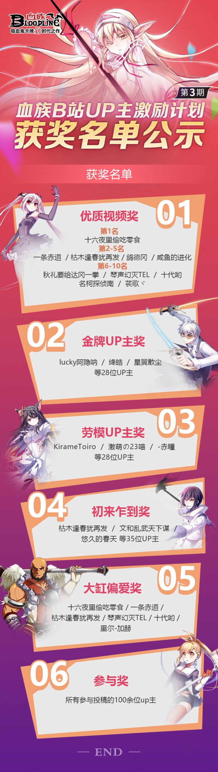 B站UP主激励计划第三季已经圆满结束啦~ 再次感谢每一位UP主的热情参与!本次活动优秀的作品真的数不胜数,让小Q应接不暇!血裔们的才华简直都要溢出屏幕,一下子就击中了小Q的.... 心巴(*≧▽≦)本次活动各项奖励已统计评选完毕,现在让我们来揭晓结果吧!此次活动获奖者名单如下:优质视频奖具体获奖作品如下:第一名:《来自遗失之岛的金精灵~露露缇雅》作者:十六夜里偷吃零食第二名:《手书 血