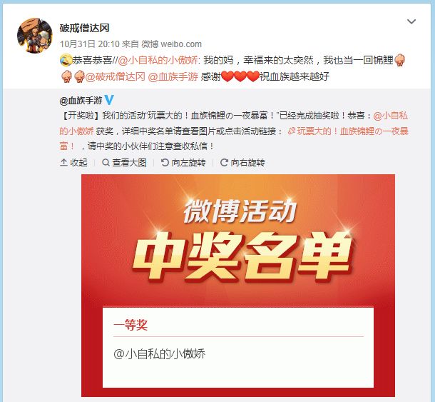 血族锦鲤@小自私的小傲娇闪亮登场~要不要去他的微博蹭波欧气呢?≖‿≖✧然后没有被点中的其他同学们也不要灰心哦~尽请期待下一次活动吧!如果大家有什么有(pian)趣(yi)的活动方案也欢迎向我们安利哦~╰(●’◡’●)╮—————大家好我是分割线——————喜闻乐见的福利环节开始咯~微博关注“血族手游”并转发此条微博,成为血族锦鲤赢取独一无二的豪华奖励!传送门: