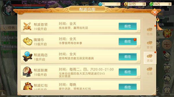 帮派系统帮派系统在玩家等级达到25级之后即可选择创建帮派或者加入帮派哦,下面就和大家聊聊帮派的一些功能; 帮派玩法:帮派首领、猜猜乐、帮派商店、帮派联赛、帮派红包等玩法; 帮派首领由帮派高层开启帮派首领,开启后每个玩家都可以前往挑战,获胜之后可获得丰富的道具奖励; 猜猜乐玩家可以选择“大”“小”,选好之后系统会随机出现点数,猜中即可获得大量银两奖励,猜错不要怕也会有安慰奖; 帮