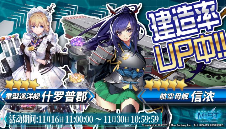 实施期间2018年11月16日(周五)12:00:00~2018年11月30日(周五)11:59:59(日本时间)2018年11月16日(周五)11:00:00~2018年11月30日(周五)10:59:59(北京时间)特别建造·开发计划内容在本次特别建造计划中,以下两名队员的建造概率上升。★★★★★ 航空母舰 信浓(CV:福原綾香)★★★★ 重巡洋舰 什罗普郡特别开发计划期间中,1