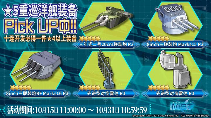 実施期間2018年10月15日(周一)12:00:00~2018年10月31日(周三)11:59:59(日本时间)2018年10月15日(周一)11:00:00~2018年10月31日(周三)10:59:59(北京时间)特别建造·开发计划内容在本次特别建造计划中,以下两名队员的建造概率上升。★★★★★ 重巡洋舰 得梅因(CV:山本希望)★★★★ 航空母舰 复仇特别开发计划期间中,10